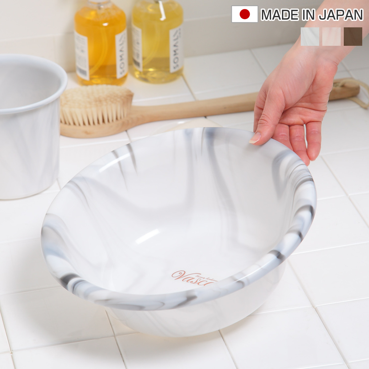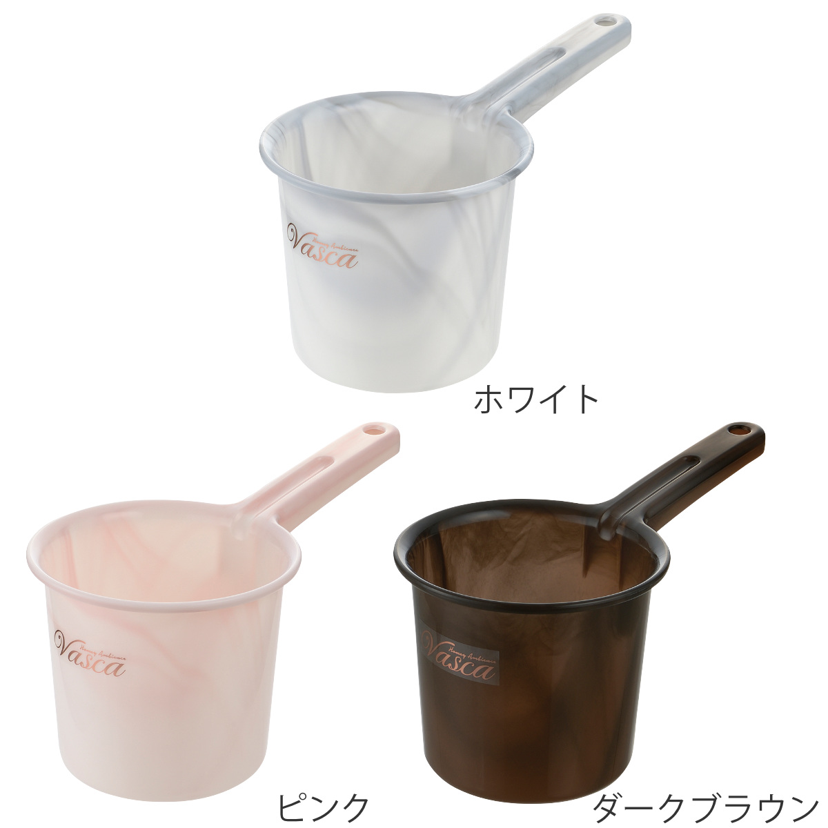 ゆるやかに波を打ったような大理石調の模様が印象的な手桶です。バスルームに人気のテイスト、大理石・珊瑚・木目調などにピッタリな3色を揃えています。浴室の壁面の色や素材感に合わせて、上質な心落ち着く空間を演出します。