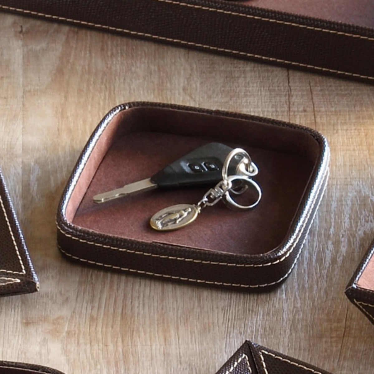 卓上使いにぴったりな【22cm幅 長方形】小物トレーです。シンプルながら、本革のような高級感やステッチのデザインがスタイリッシュでお部屋にしっくりと馴染みます。【22cm幅 長方形】サイズは、ネックレスや指輪などのアクセサリートレーやペンホルダー、眼鏡を置くのに適しています。