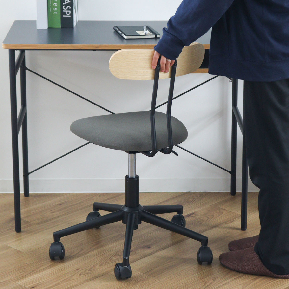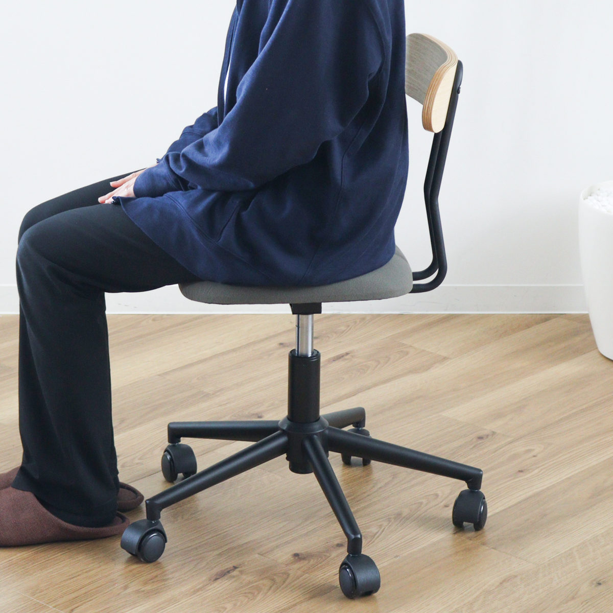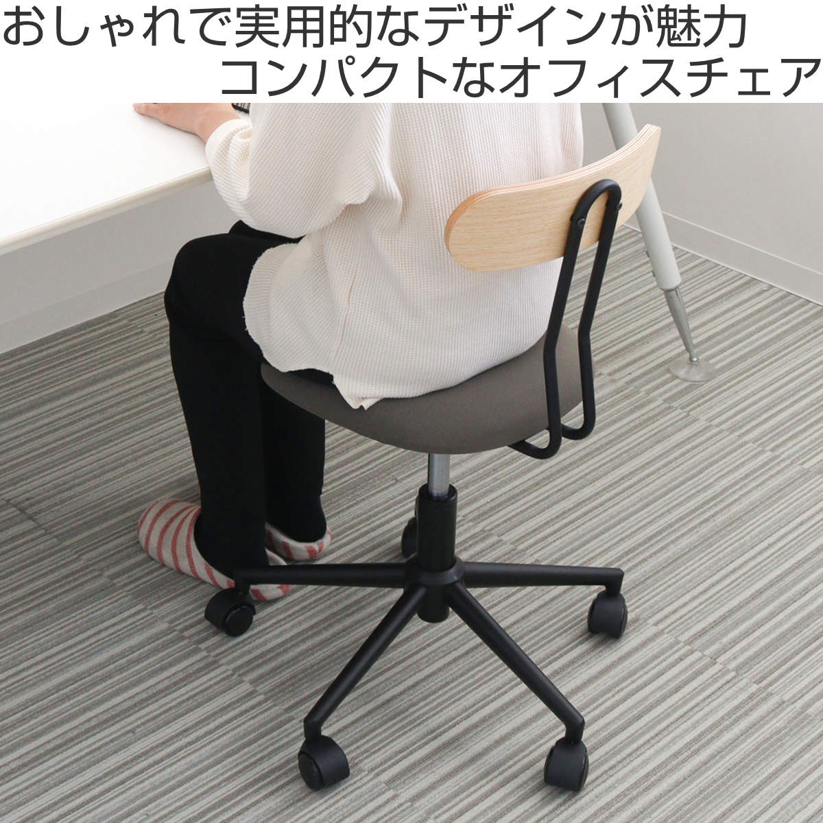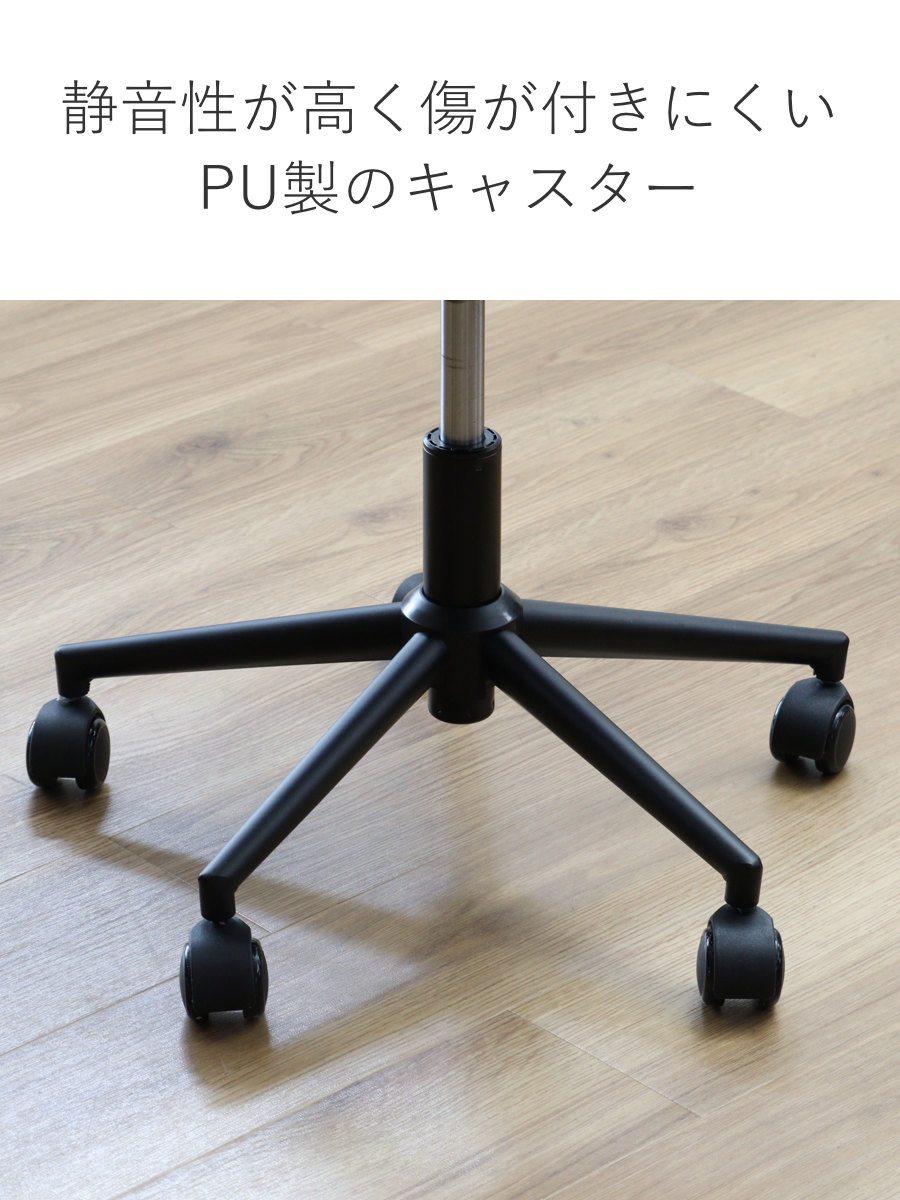 キャスターは静音性が高くスムーズな回転のPU製で、フローリングの床が傷付きにくくなっています。