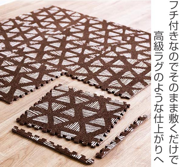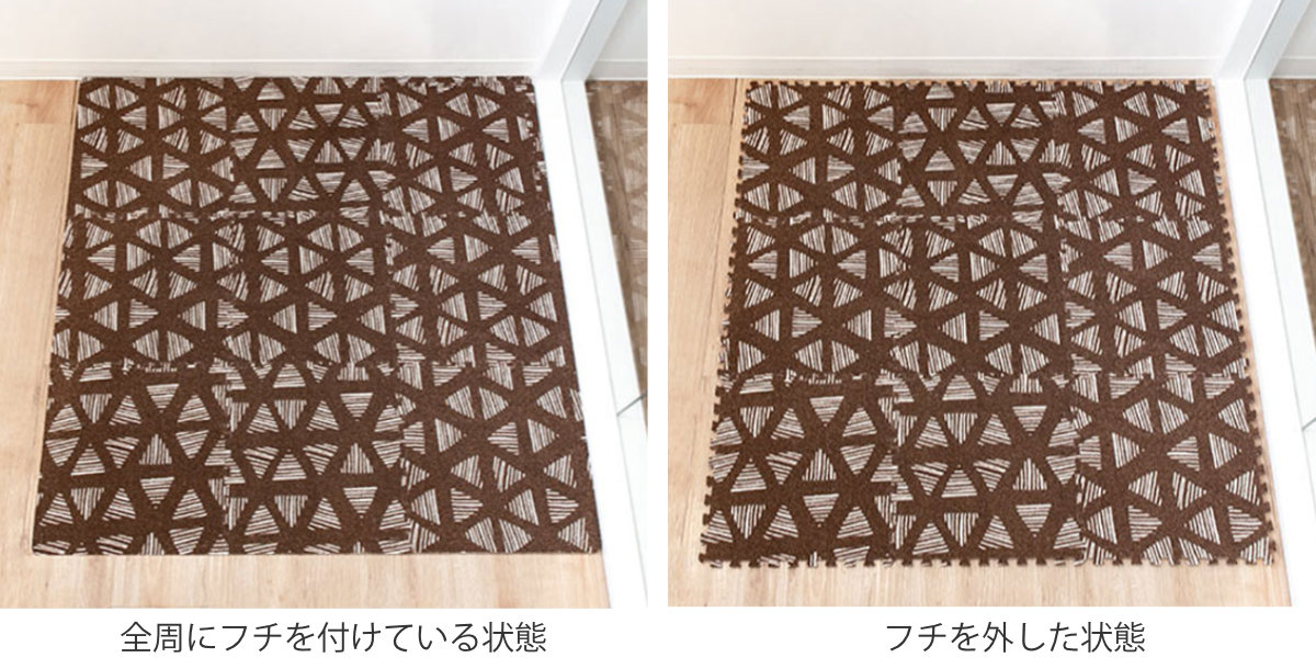 全周にフチをつけたり外したりできます。お部屋の壁際のみにフチを使用したり、場所に合わせて形を変えられます。繋げ方は様々で、自由にレイアウトできます。
