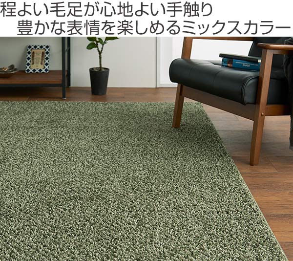 表情のある濃・中・淡3色のミックスカラーで濃いフローリングから明るいフローリングまで合わせやすくなっています。長毛で上質感があるセミシャギーの心地良い手触りをお楽しみください。ホットカーペット・床暖房にも対応しているので季節を問わず年中使っていただけます。