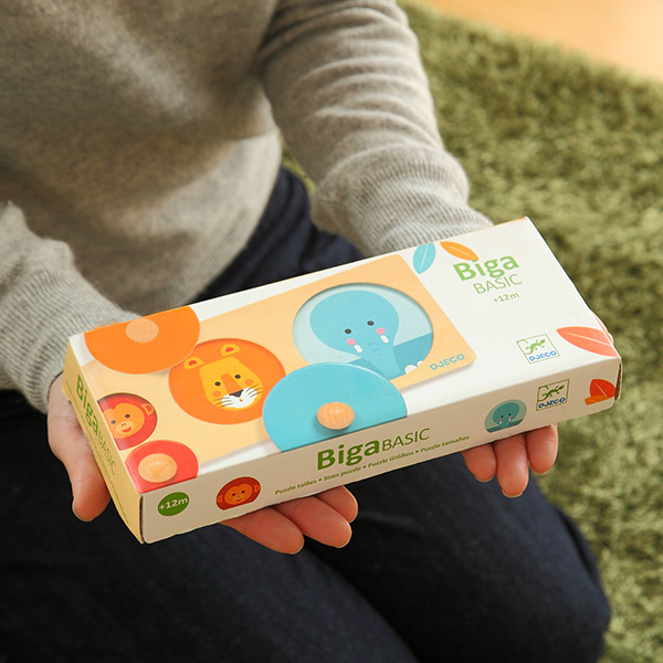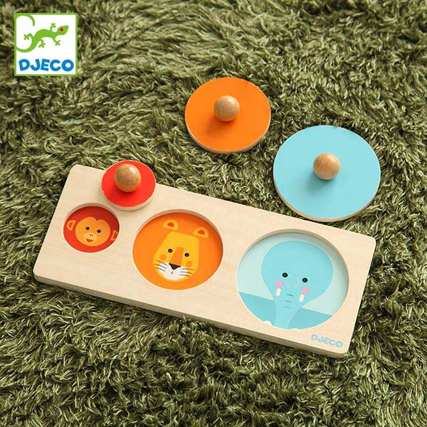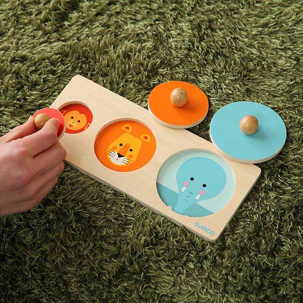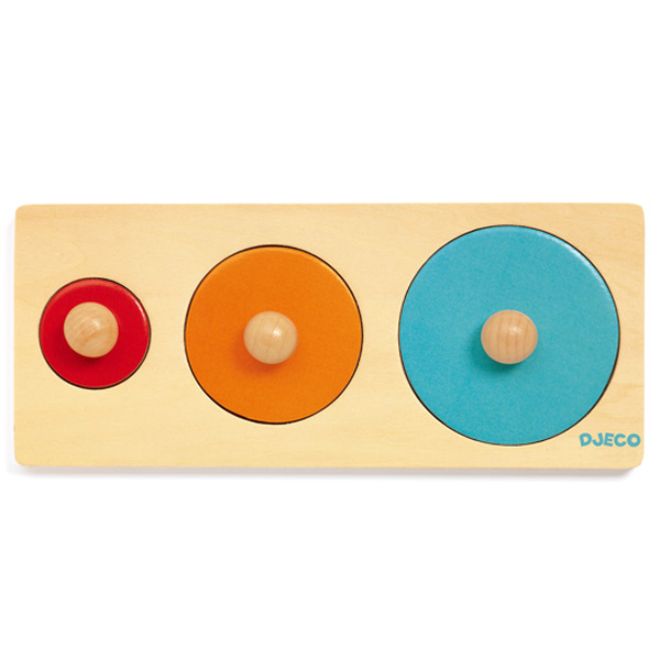 大、中、小の丸形を合わせて楽しむパズルです。遊びを通して、色や形、大きさなどの概念を身に付けることができます。ピースには持ち手がついているので掴みやすく、初めてのパズルにもぴったりです。