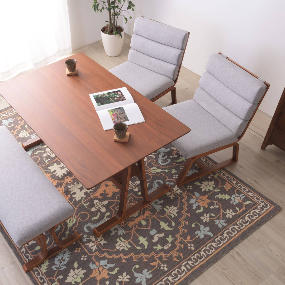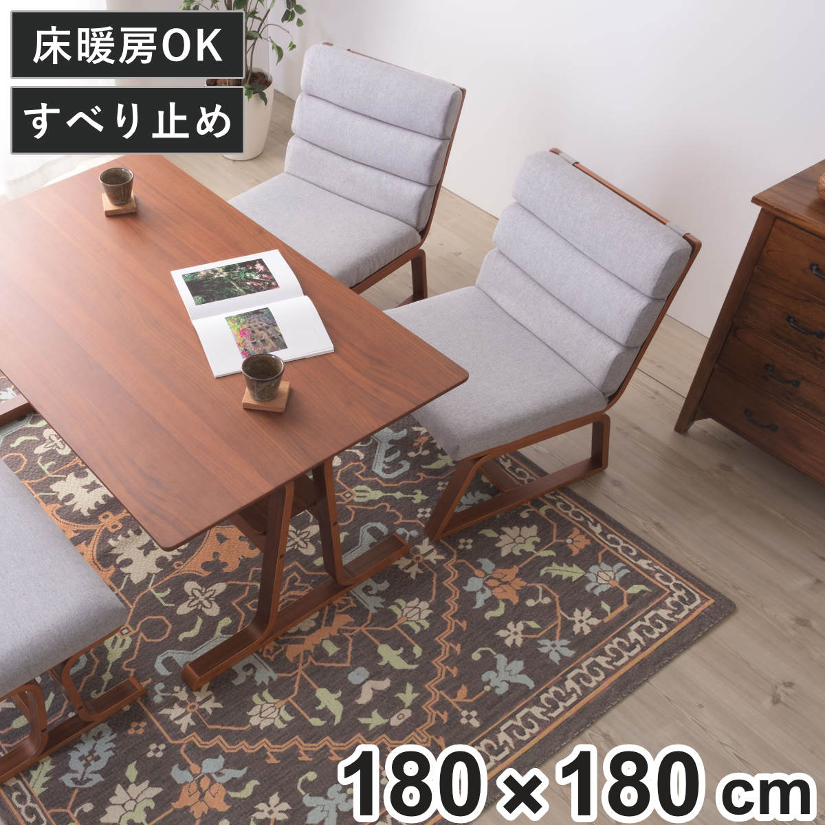床暖房対応なので、寒い冬でもポカポカでお使いいただけます。裏材にはドットのすべり止め加工が施されています。フローリングの上でもラグがズレにくく、お掃除の際もストレスがありません。