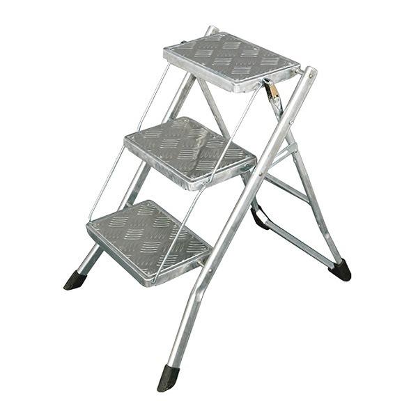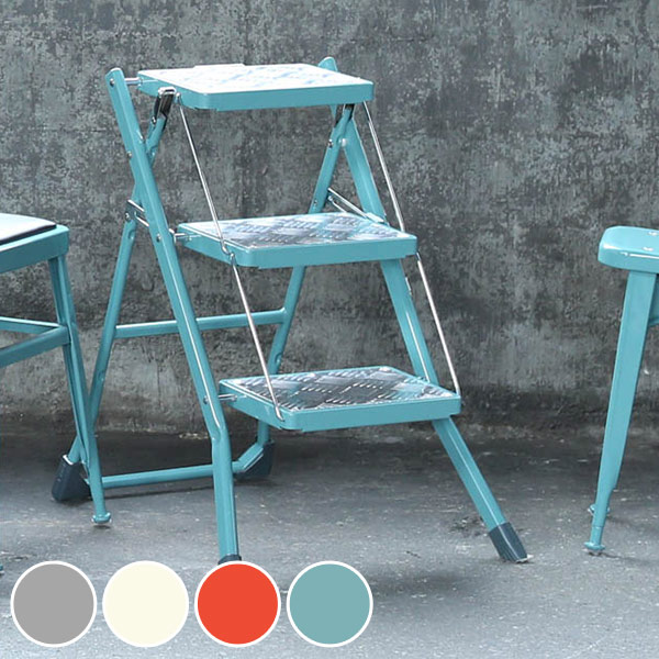 折り畳み可能な3段のお洒落な脚立です。開閉時の鈍い金属音や、踏台の型押しもたまりません。