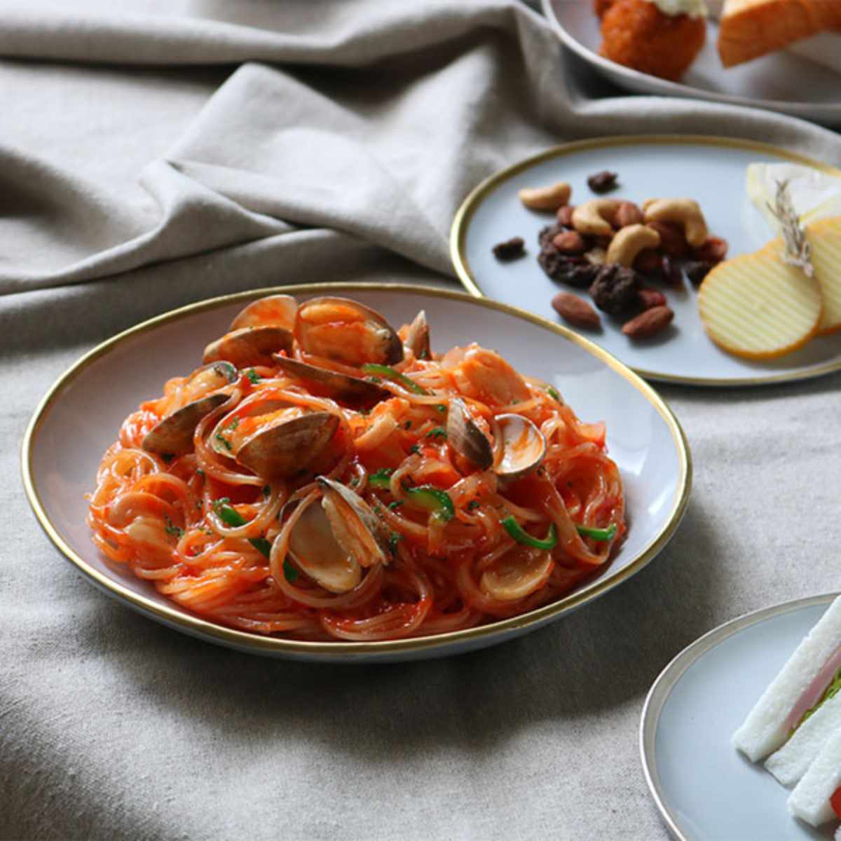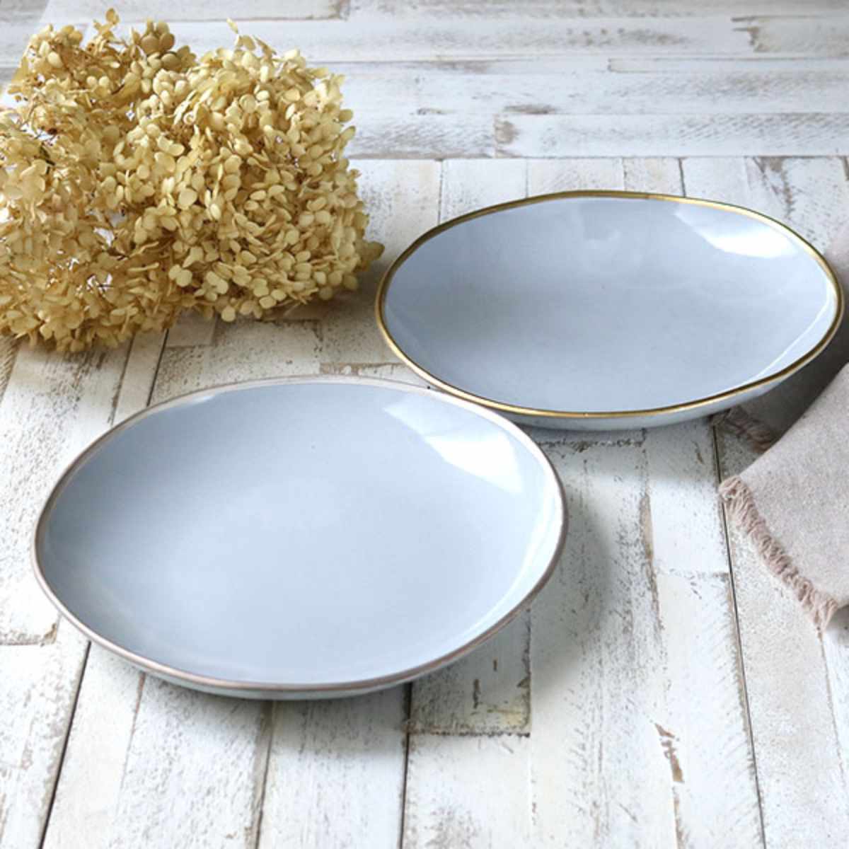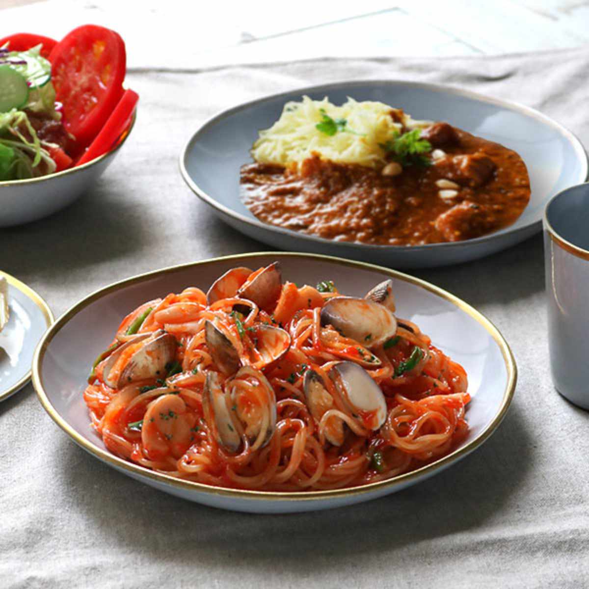 優しいペールグレーに、アクセントとなる縁取りが美しいカレー&パスタ皿です。カレーやパスタだけでなく、メイン料理や、副菜を盛り付けたワンプレートランチにも最適です。均一ではないリム(ふち)と上品な色味がお料理や野菜の色をより一層引き立てます。