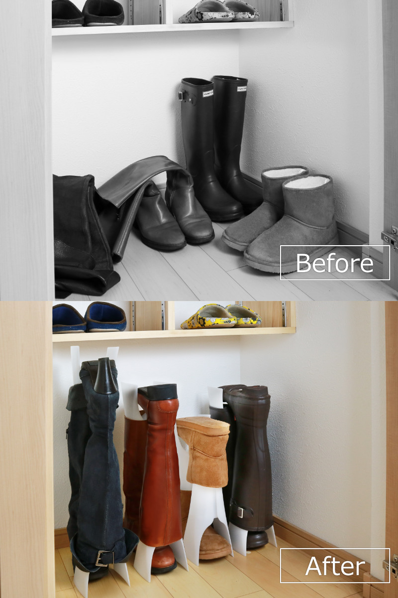 上下で交互に組み合わせることによって、ブーツ1足分が片足分のスペースにおさまります。約2倍のブーツを収納できるので、下駄箱・玄関に余裕が生まれます。