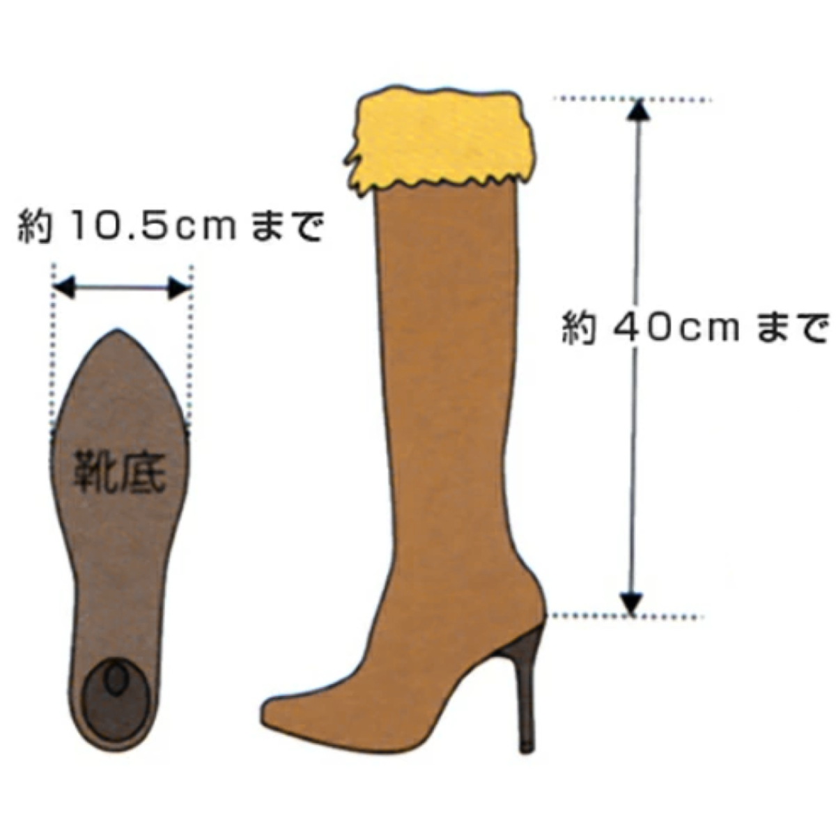 対応するブーツのめやすサイズは、靴幅約10.5cmまで、ブーツの筒丈約40cmまでです。