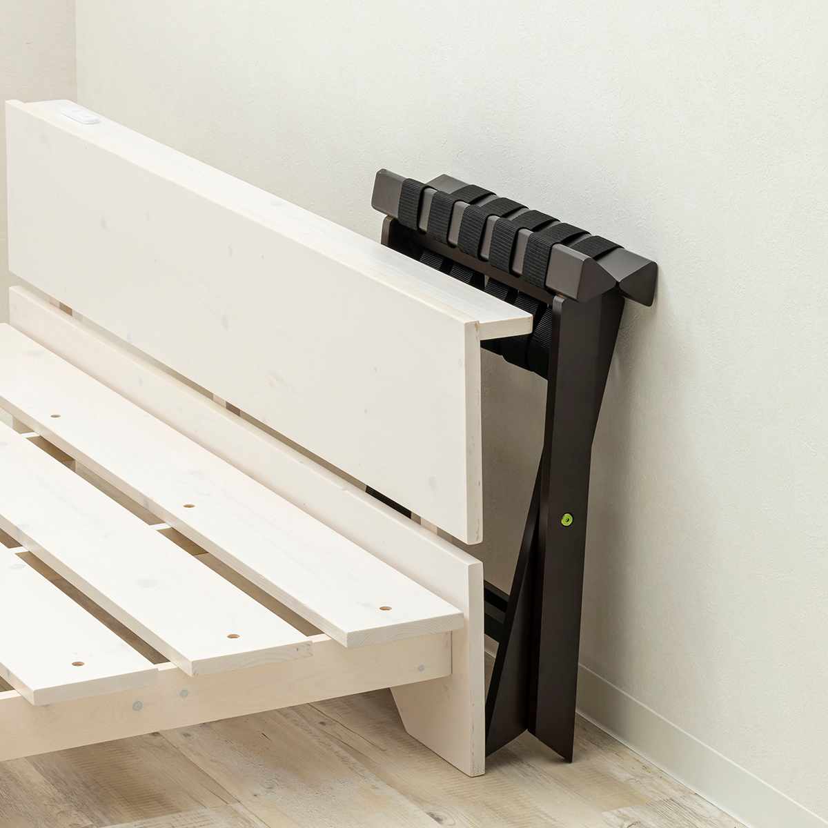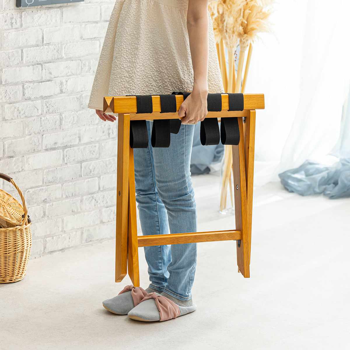 ホテルの客室用に作られた、天然木を使用したバゲージラックです。スーツケースやバッグを床に置かずに使用できるため、衛生的で腰への負担を軽減できます。また、モダンなデザインなので、小物を置いてインテリアラックとしても活用可能。リビングや寝室、玄関など様々な空間でお使いいただけます。