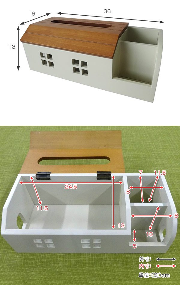 ティッシュボックスをすっぽり収納できる、おうち型ボックスです。スマホやリモコン・ペンなどの文具をまとめて収納する事ができ、テーブルの上をスッキリさせる事ができます。
