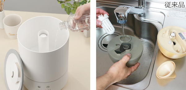 蓋を外して上部から水を注ぐだけで給水でき、重たいタンクの持ち運びが不要です。タンク容量は4Lと大容量で、給水の手間が減ります。