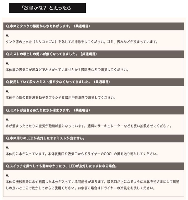 | 備考 | タンク容量:4L 電源:DC24V1A(コード長:約1.5m) 噴霧方法:超音波振動方式 適用畳数:(約)木造和室5畳/プレハブ洋室8畳 噴霧量:最大300ml/h ±30ml 連続使用時間:(約)13時間 オフタイマー:2・4・6・8時間 消費電力:24W ※一部のアロマオイル、アロマウォーターには対応しておりません。 |