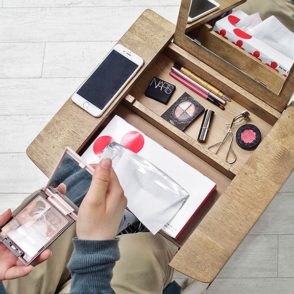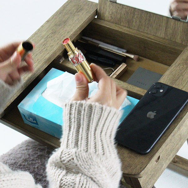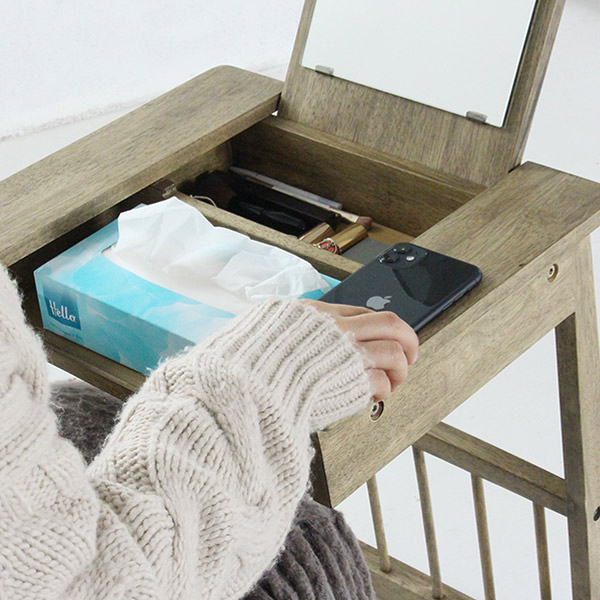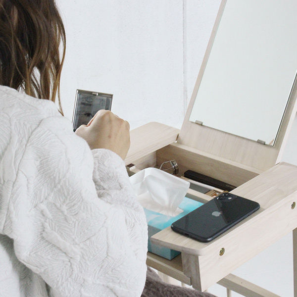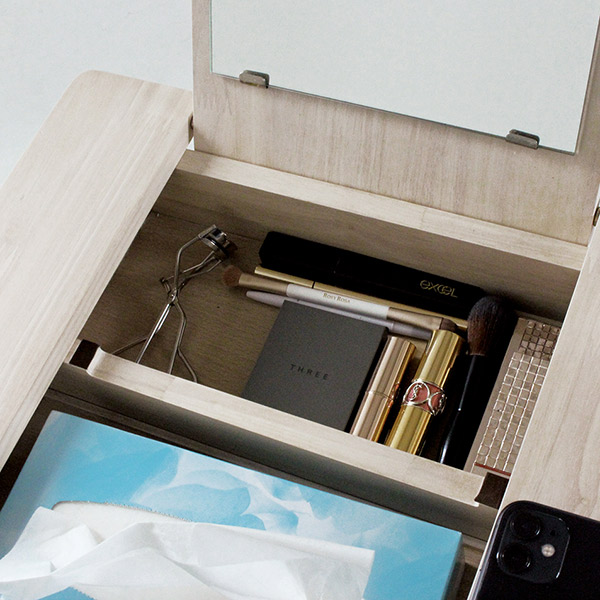 天板を開放すると収納スペースがあり、毎日使う化粧品やアクセサリーなど一箇所にまとめて収納することで身支度が楽になります。