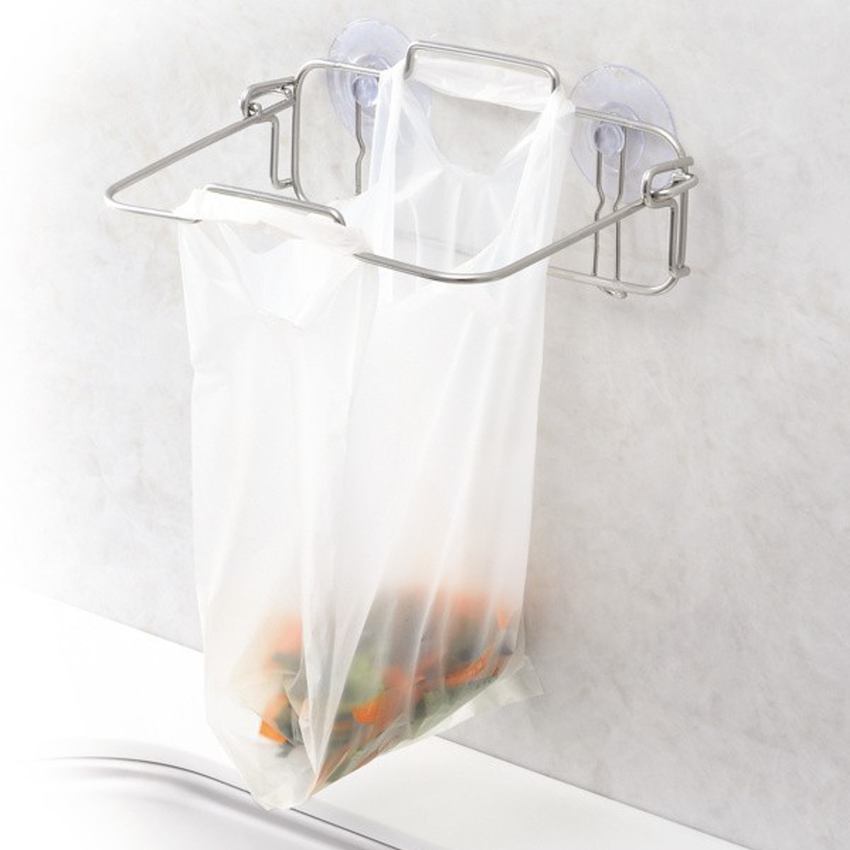 吸盤付きでお好みの壁面に設置出来るゴミ袋ハンガーです。キッチンの野菜くずなどの生ごみをそのまま捨てられます。ごみ袋の持ち手を引っ掛けて、袋の口を開けたまま設置できるので、ごみが片手でも入れやすいのが便利なポイントです。