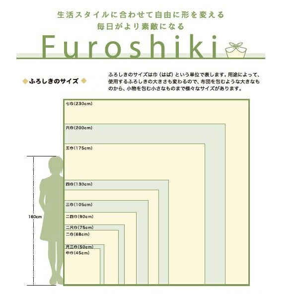 お弁当箱や、手土産などを包むのに最適で、工夫次第で、ブックカバーやティッシュカバーとしてもご使用いただけます。折りたためば、ポケットに収納できるコンパクトなサイズで、使いやすい大きさです。