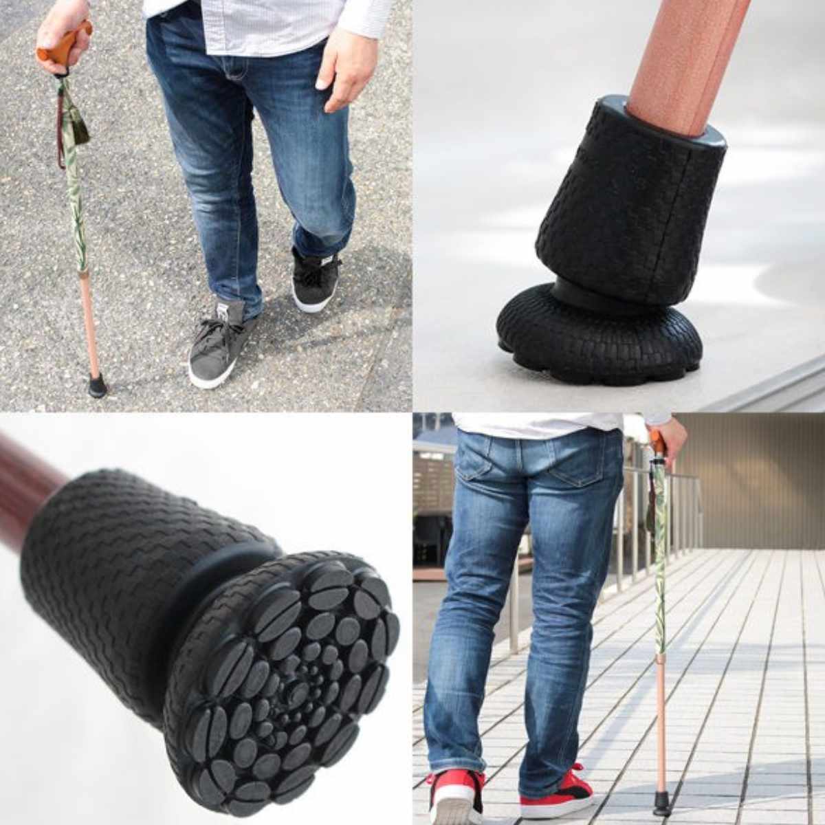 濡れた地面でも密着しやすい構造のため、一般的な先ゴム(下の画像)よりも滑りにくく、安全に歩行できます。
