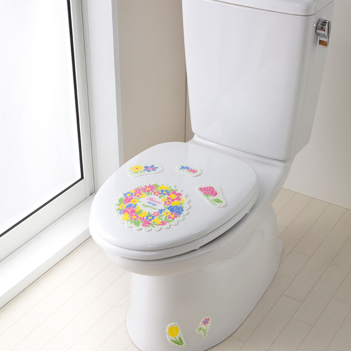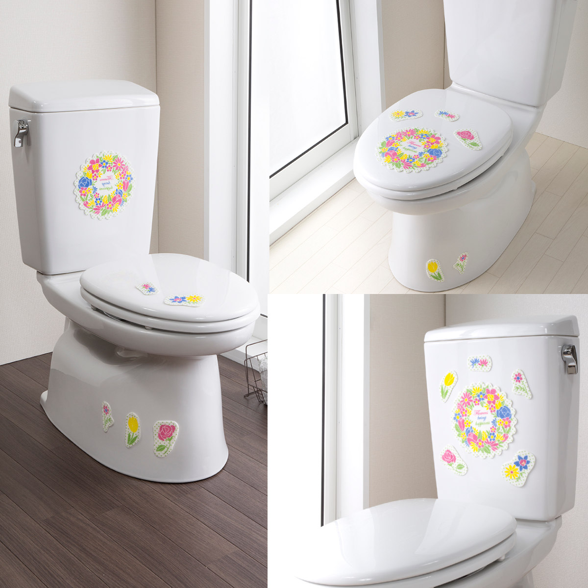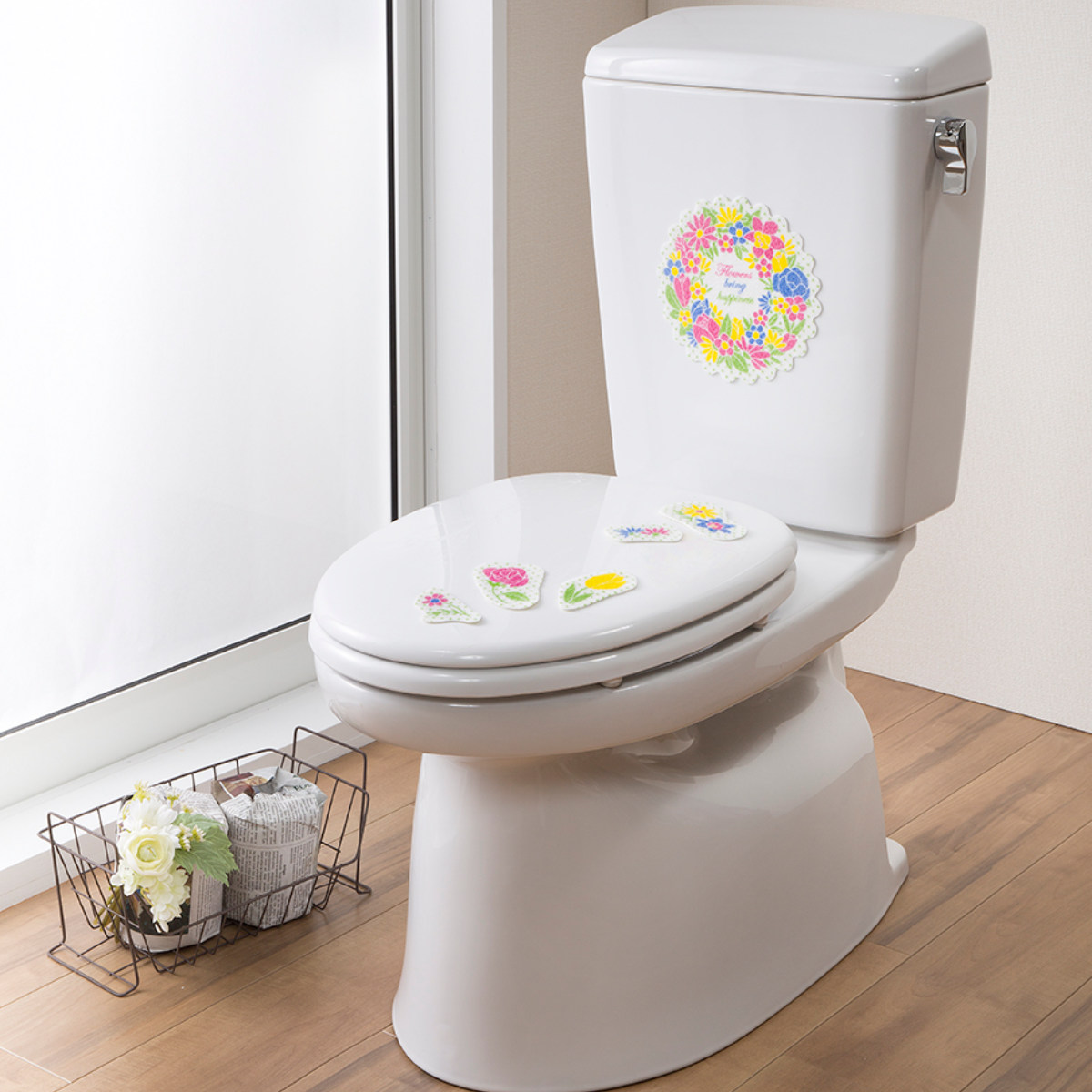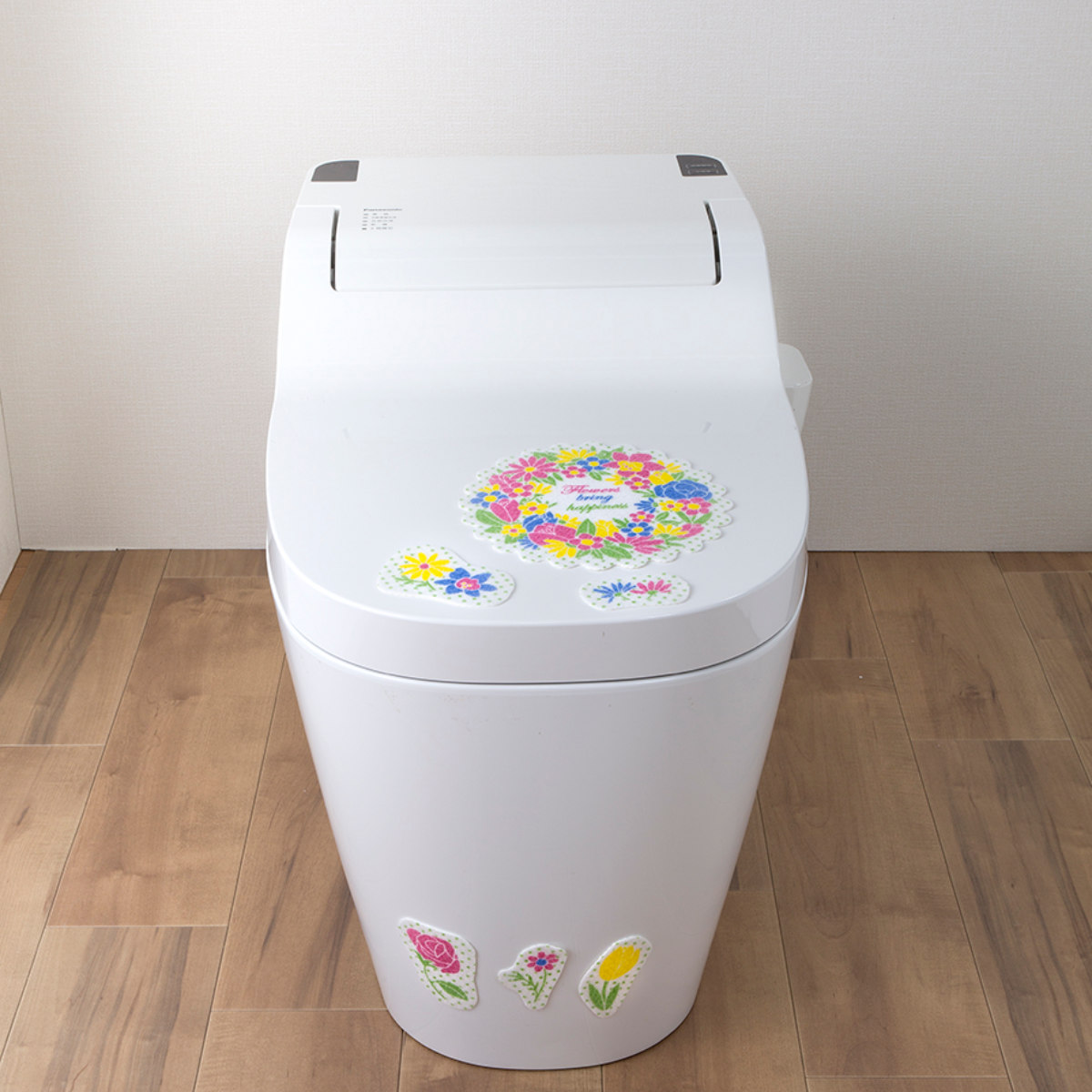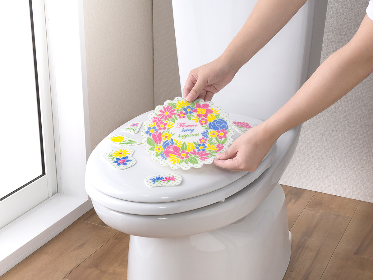 鮮やかなリースフラワー柄で、トイレ空間を明るくできます。レイアウトはあなた次第なので、オリジナルのデザインが出来上がります。