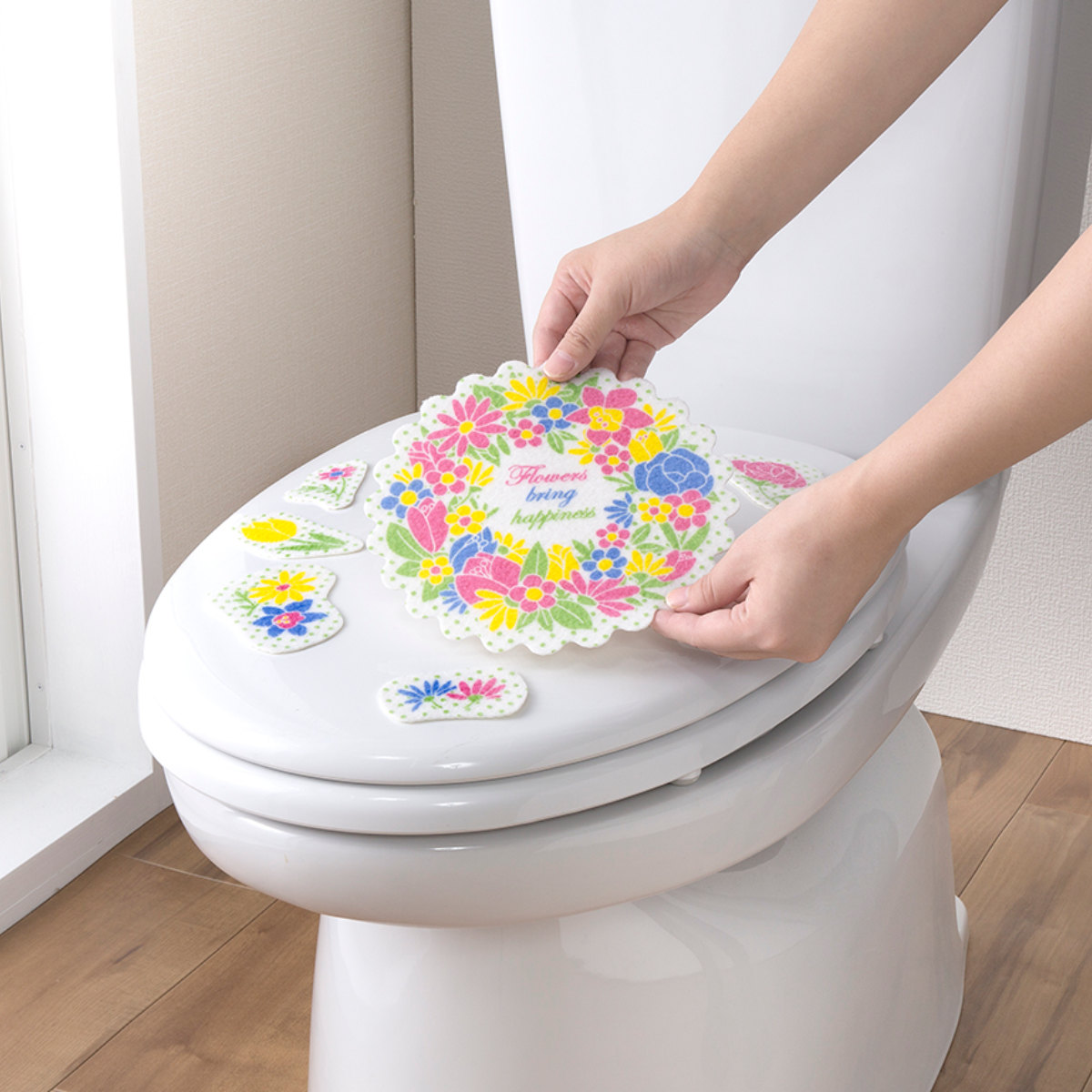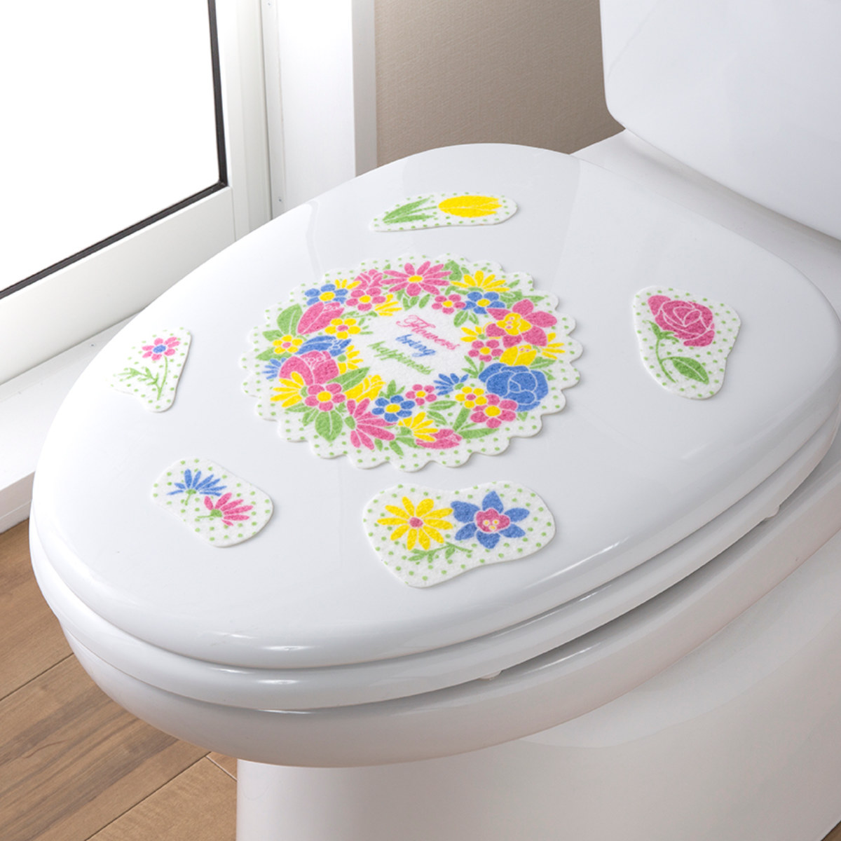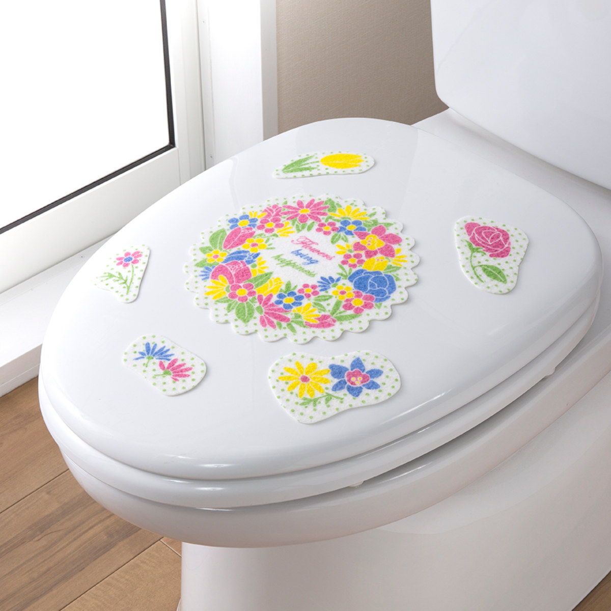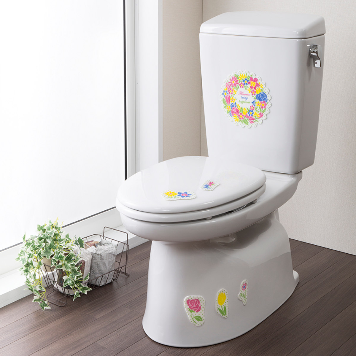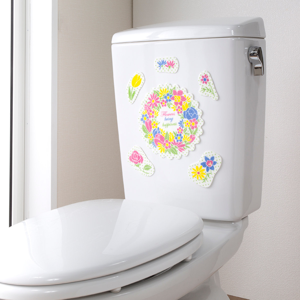 鮮やかなリースフラワー柄で、トイレ空間を明るくできます。レイアウトはあなた次第なので、オリジナルのデザインが出来上がります。