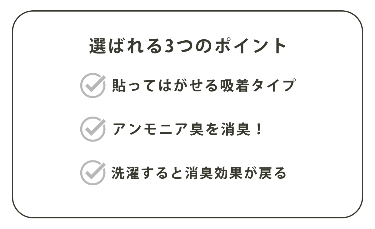 アンモニア臭を消臭する加工がされており、トイレのイヤな臭いを抑えてくれます。カテキン入りのアクリル樹脂が使われているのがポイントです。
