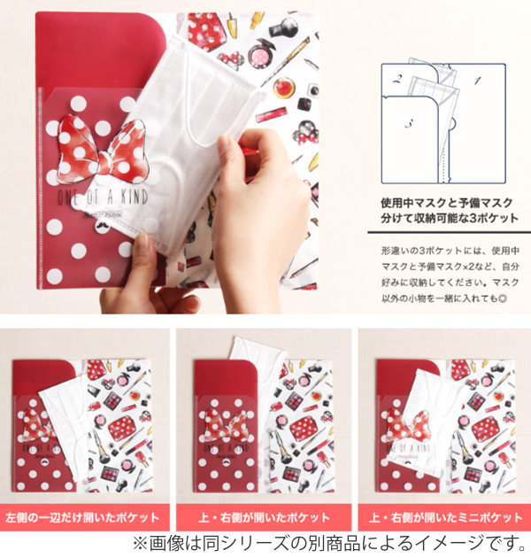 予備マスクや外したマスクを分けて収納出来る、便利な3ポケットタイプのマスクケースです。ディズニーキャラクターが描かれたデザインで、表・裏・見開きにはそれぞれ絵柄が違います。クリアファイルのような素材に抗菌加工を施した安心の日本製です。携帯性に優るうえ、一時的なマスクの保管にも最適です。