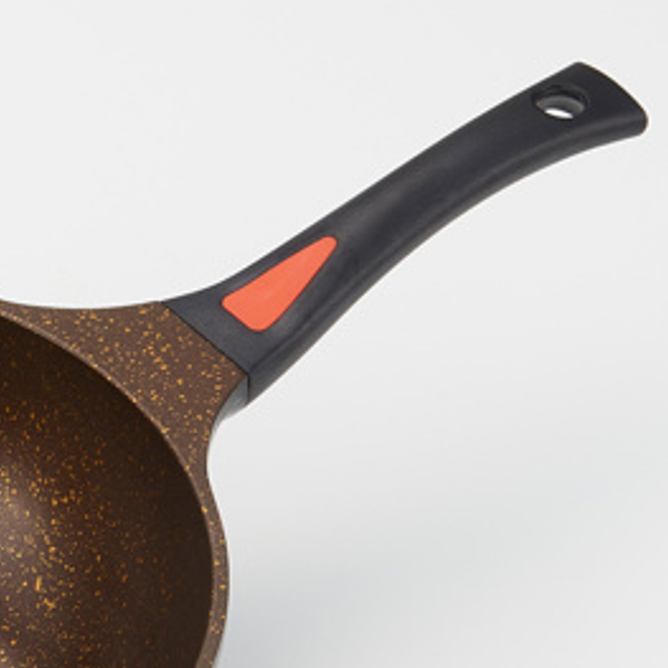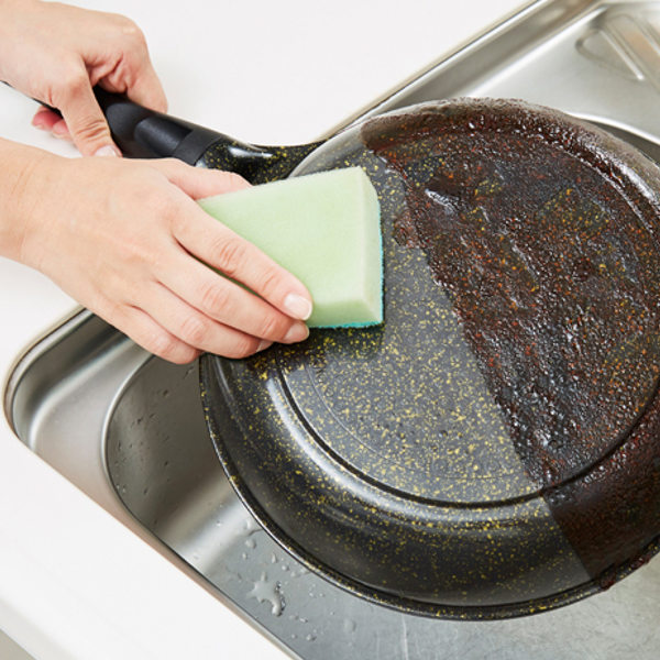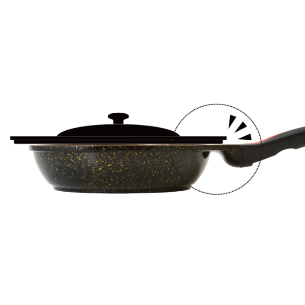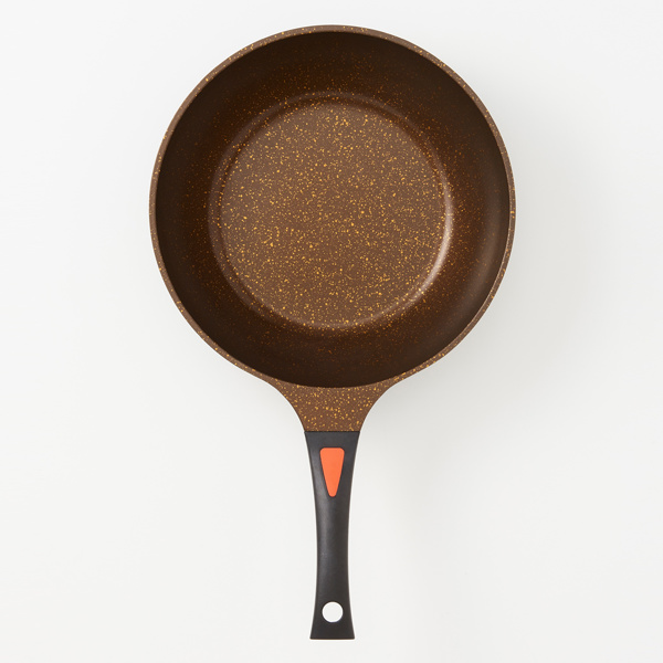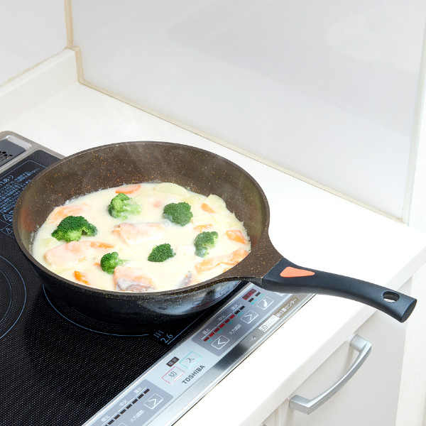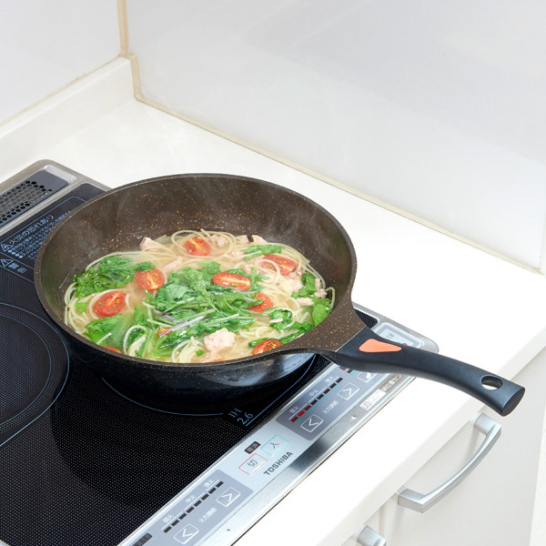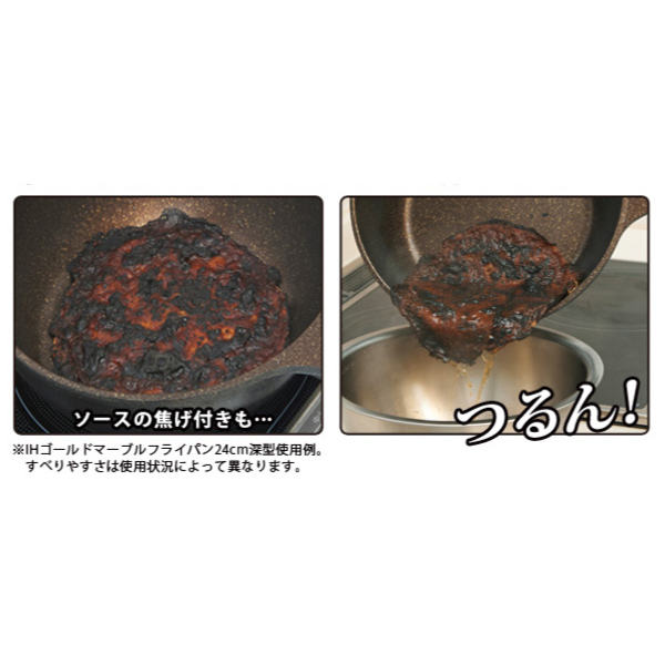 表面のゴールドマーブルコーティング(フッ素樹脂塗装)は、抜群の滑りの良さが自慢です。食材や調味料が焦げ付きにくく、少ない油で調理ができヘルシーで経済的。万一ソースが焦げ付いた場合も、お水でするんと落とせます。また、金属のヘラやトングが使える扱いやすさも魅力です。(角のとがったものは使用不可)