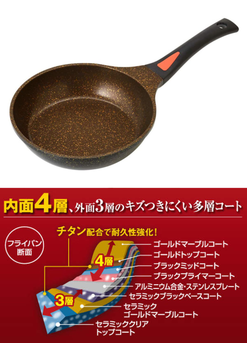 チタン配合で耐久性に特化した、多層構造のフライパンです。日本国内の正式な検査機関にて耐磨耗性テストを実施し、高いコーティングの耐久度を実証しました。