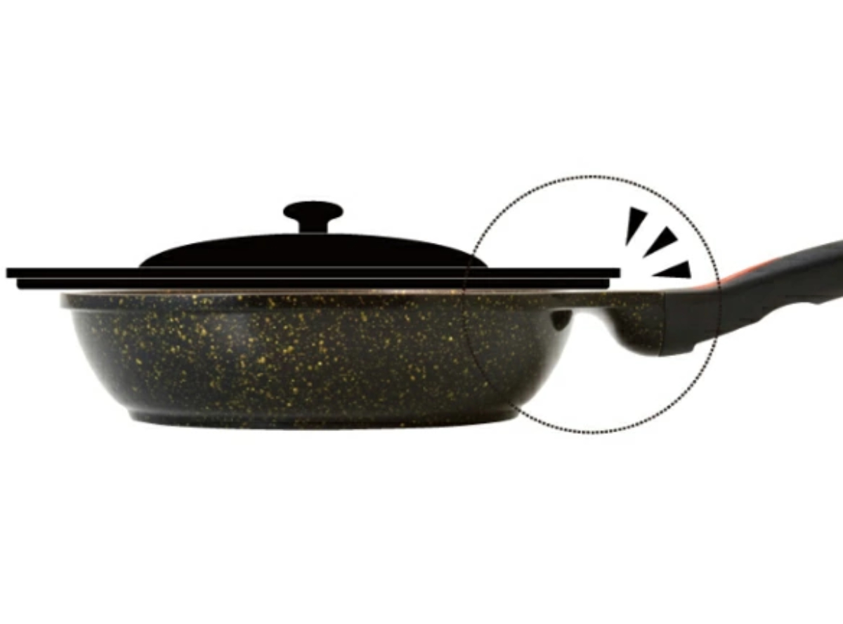 表面のゴールドマーブルコーティング(フッ素樹脂塗装)は、抜群の滑りの良さが自慢です。食材や調味料が焦げ付きにくく、少ない油で調理ができヘルシーで経済的。万一ソースが焦げ付いた場合も、お水でするんと落とせます。また、金属のヘラやトングが使える扱いやすさも魅力です。(角のとがったものは使用不可)