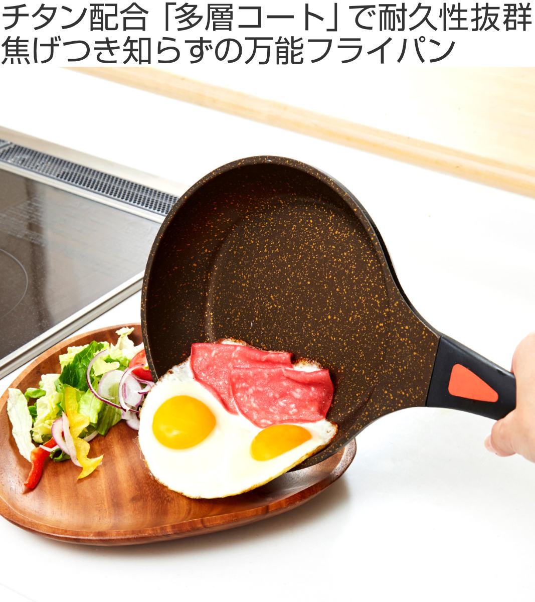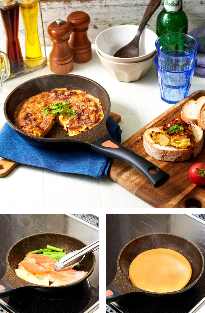 朝食やお弁当おかず、おつまみなど、ちょっとした一品作りに最適な小さめサイズです。底面径の広い浅型タイプなので、パンケーキやオープンオムレツなども上手に焼けます。