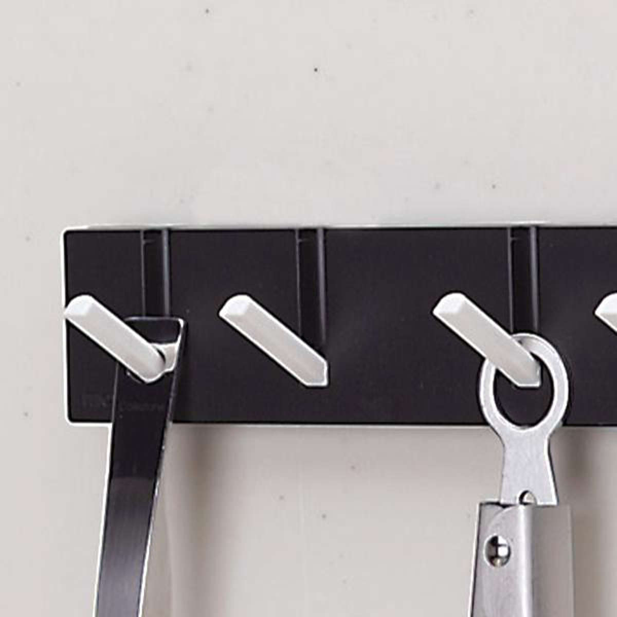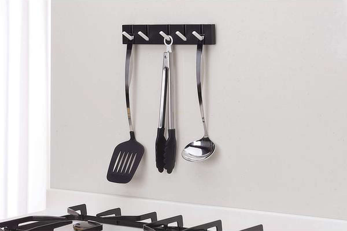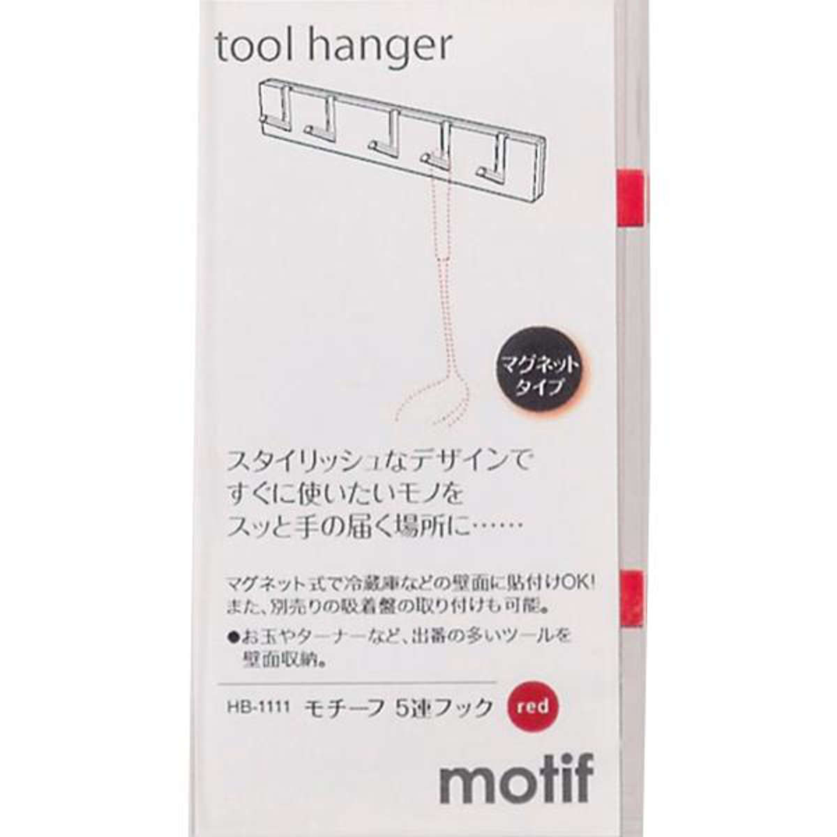 強力なマグネットでレンジフードや冷蔵庫に取り付けできる5連フックです。別売りの専用吸着盤を付けるとタイル面などにも取り付け可能になります。