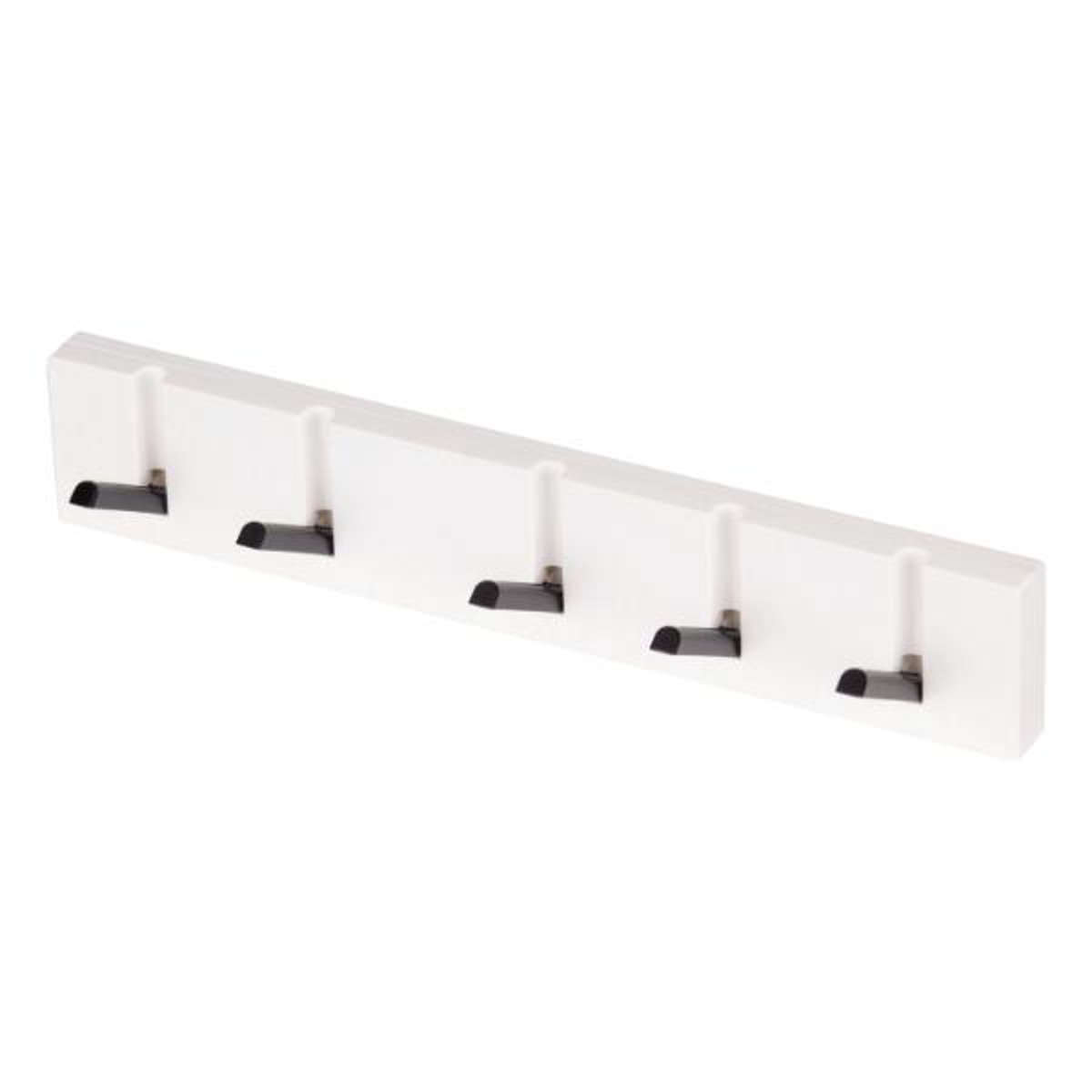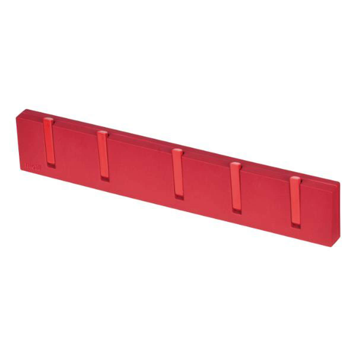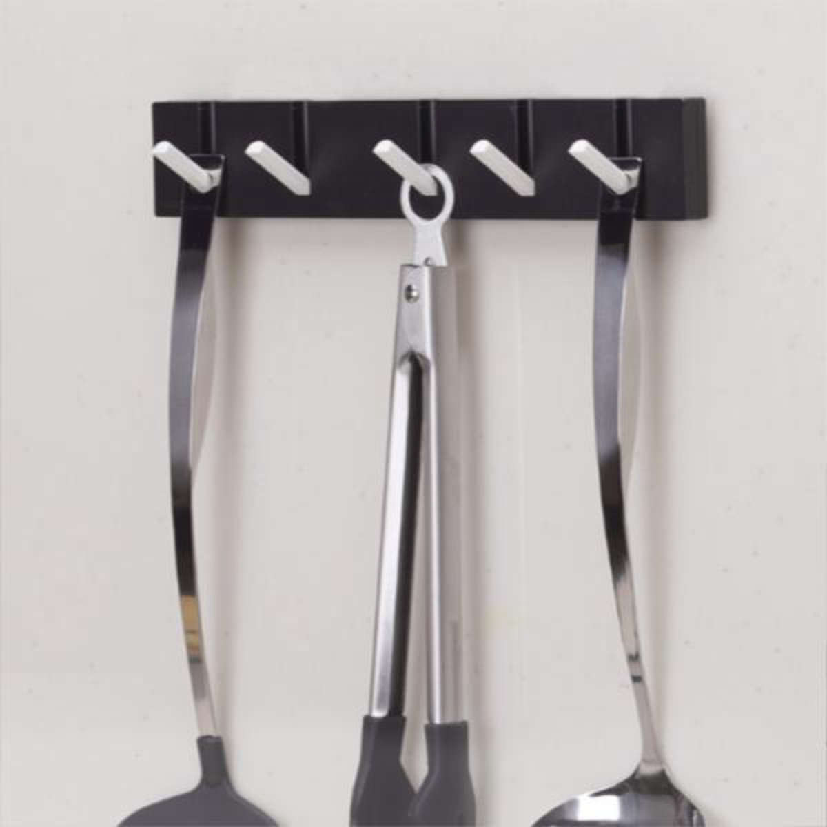 強力なマグネットでレンジフードや冷蔵庫に取り付けできる5連フックです。別売りの専用吸着盤を付けるとタイル面などにも取り付け可能になります。