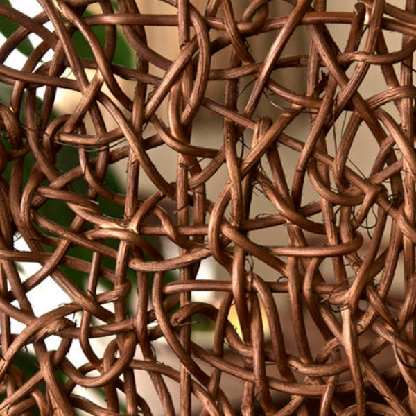 自然な風合いや素材の温かみを味わっていただけるように、材料に皮付きの籐をそのまま使用しています。そのため、材料1本1本の色の違いや、黒ずみ、斑点の部分がございます。また、籐の表面のところどころに傷のようにホーロー質がはがれた部分があります。これはトゲのある「節」を取り除いた削り跡です。これらは不良ではなく、天然素材特有の風合いによるものです。