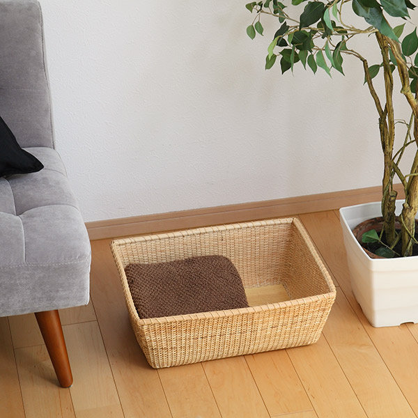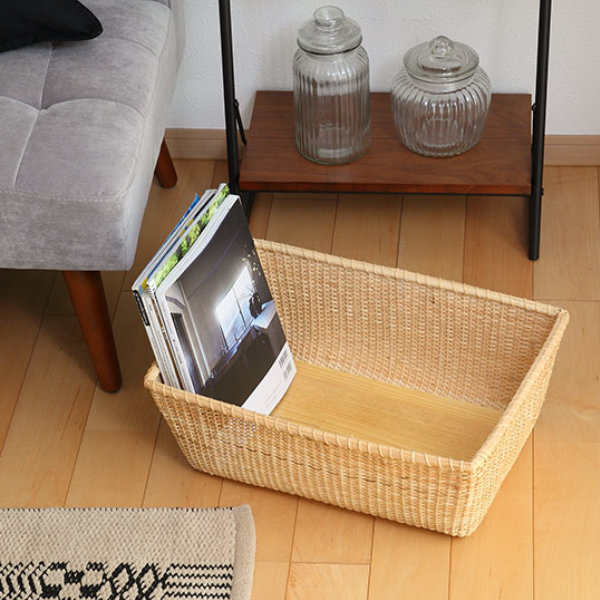 天然素材の籐で編まれた、ナンタケット風バスケットです。ソファーや机横に置いても邪魔にならない大きさです。使う頻度が多い鞄やブランケット、雑誌類などを入れて置くだけで部屋が彩り、一目を置けるバスケット収納です。