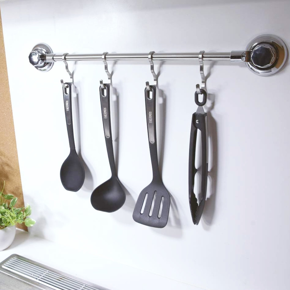 炒める、揚げる、煮込む、どの調理にも必要なキッチンツールが揃っています。シンプルなブラック×シルバーのデザインで出しっぱなしにしていても生活感が出ず、菜箸以外は吊り穴があるのでフックに掛けて場所を取らずに収納できます。