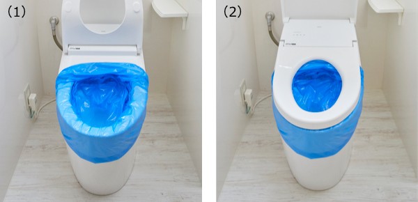 (1)、(2)トイレの便座にカバー袋(青)を取り付けます。