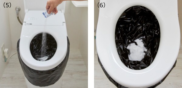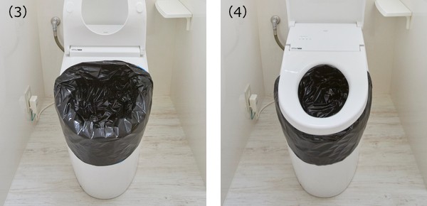 (3)、(4)さらに被せるようトイレ用袋(黒)を取り付け、便座を下げます。