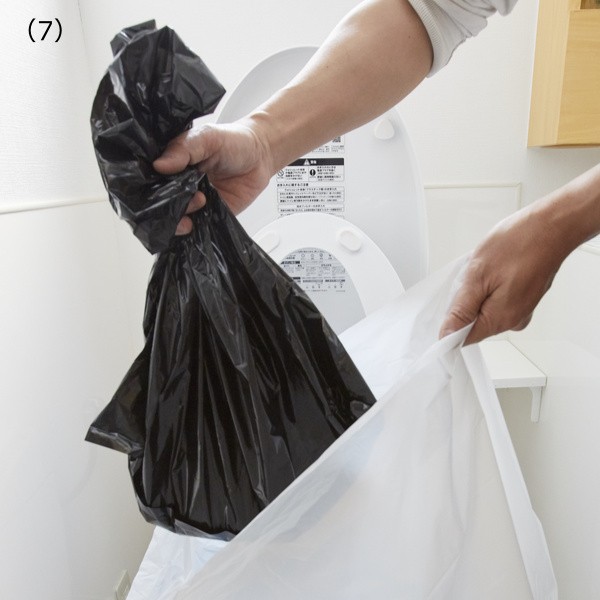 (7)トイレ用袋を取り出し、袋口をしっかり結びます。付属の処理用袋に捨てて、可燃ごみとして処分してください。