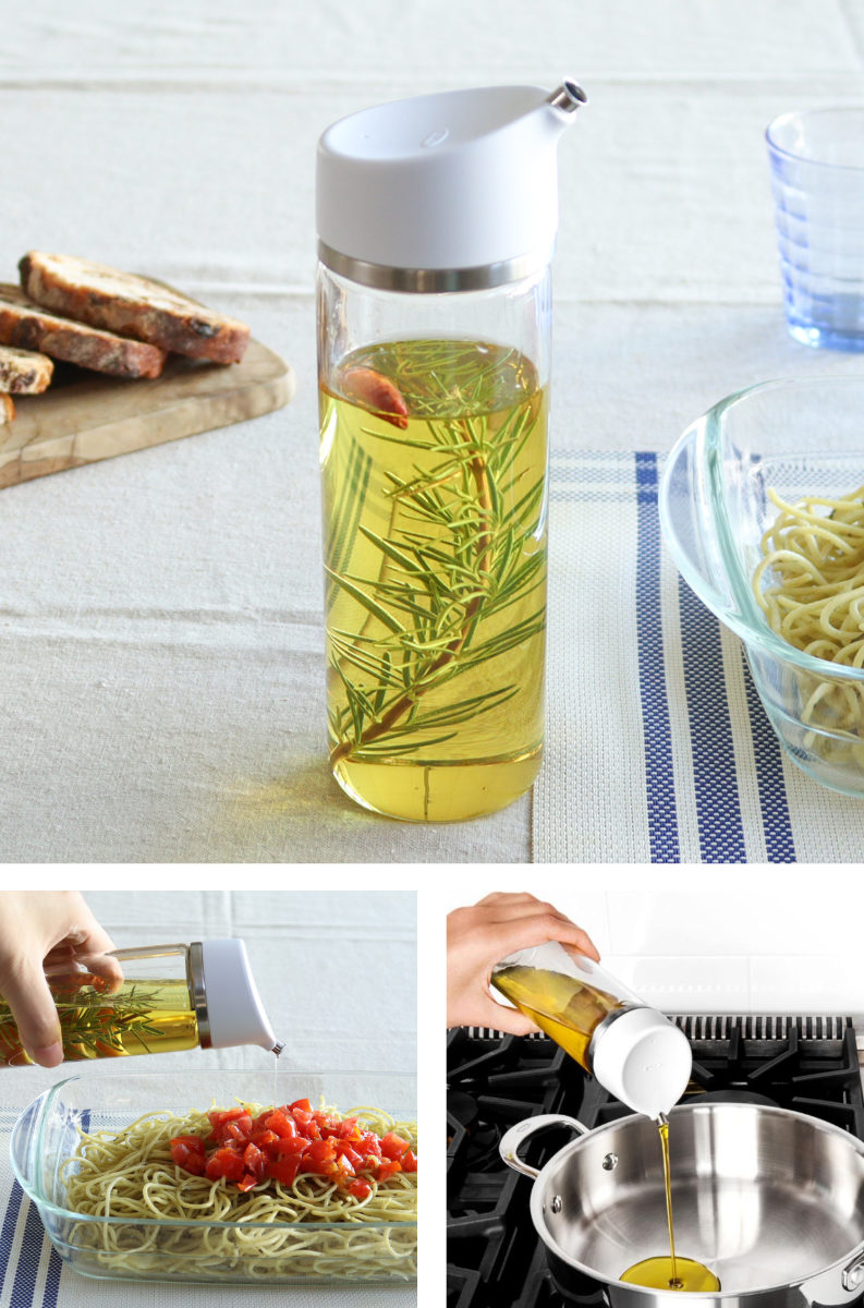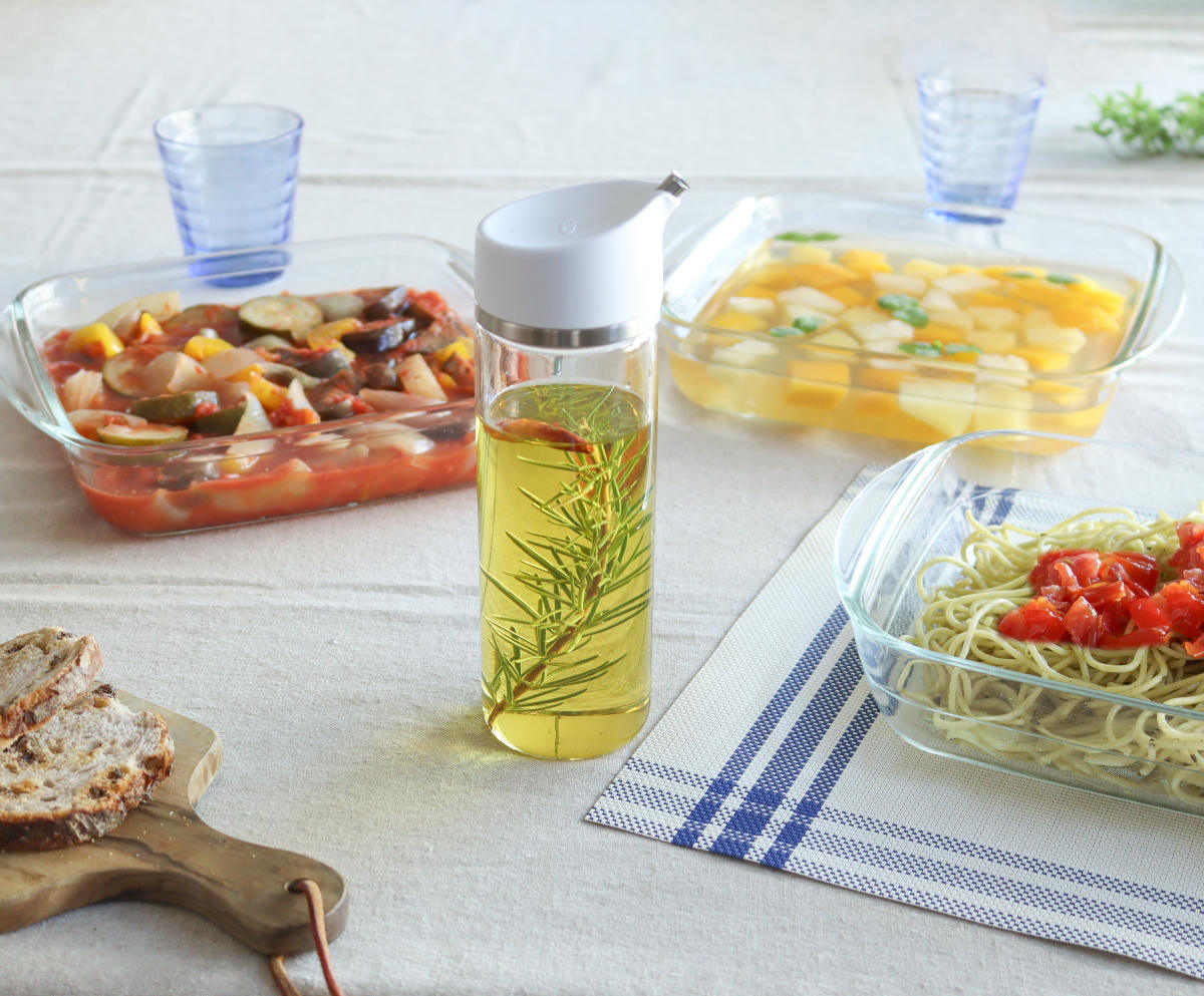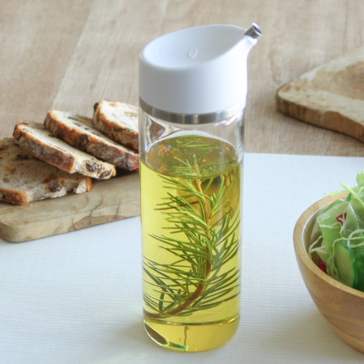 ガラス製なので、匂い移りを気にせず使えます。自家製ドレッシングを入れたり、ハーブや唐辛子を入れたスパイシーオイルも楽しめます。清潔感のあるシンプルなデザインは、食卓でも圧迫感を与えずすっきり。また小ぶりサイズなのでスペースを食わず、冷蔵庫保管もしやすいです。