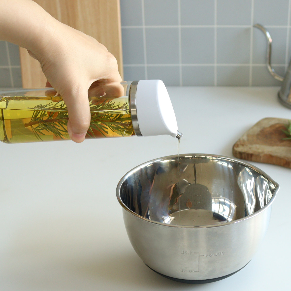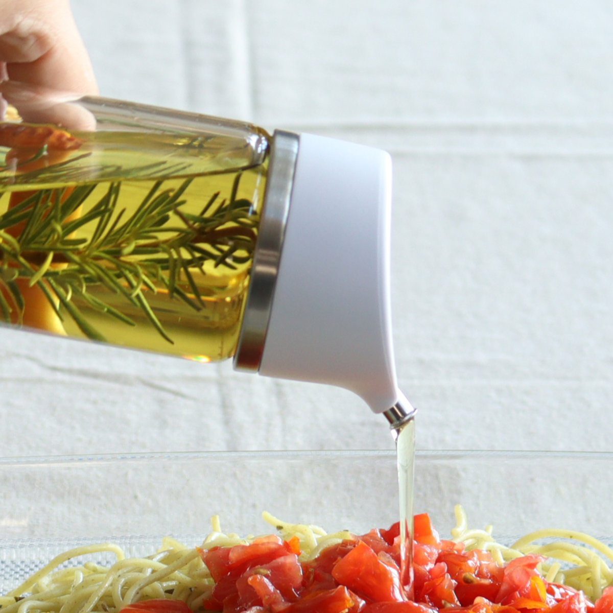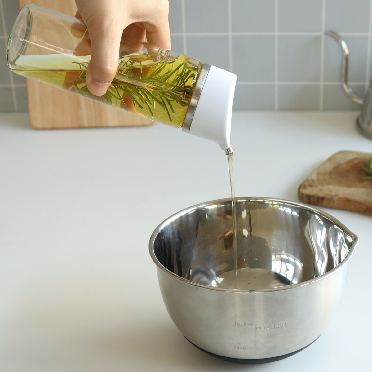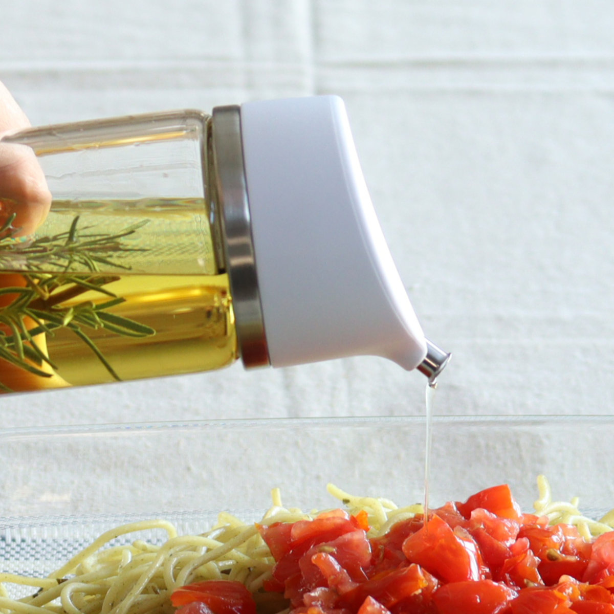 傾ける角度によって注ぎ量を調節できる、ガラス製のオイルボトルです。お料理の風味付けに少量垂らしたい時、調理中サッとフライパンに広げたい時、などシーンにあわせて使い分けられます。