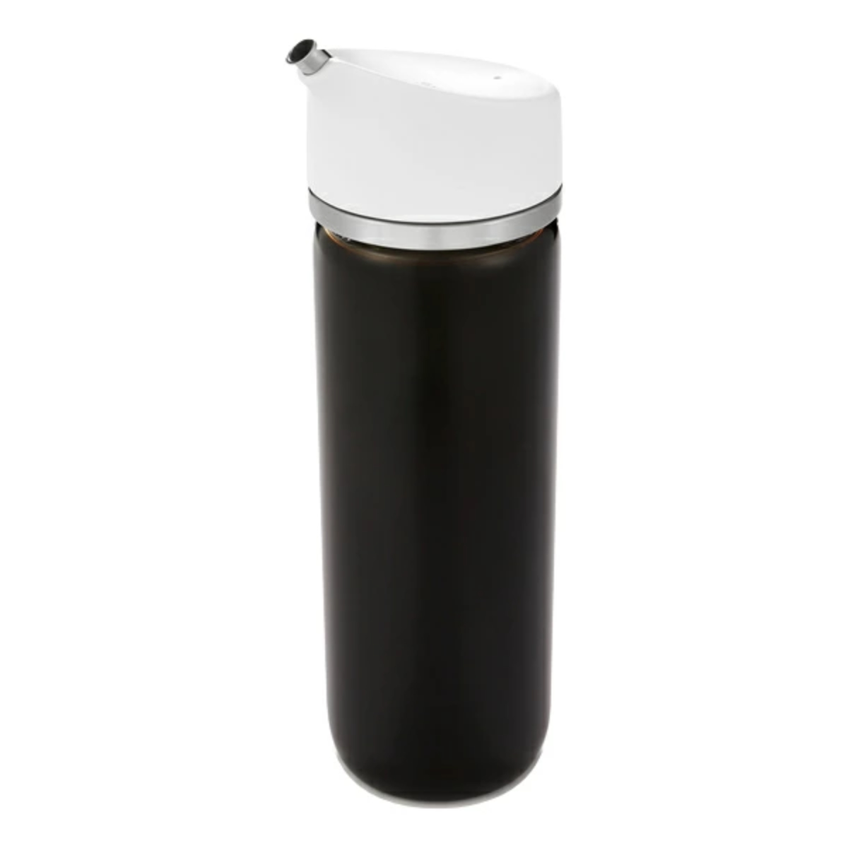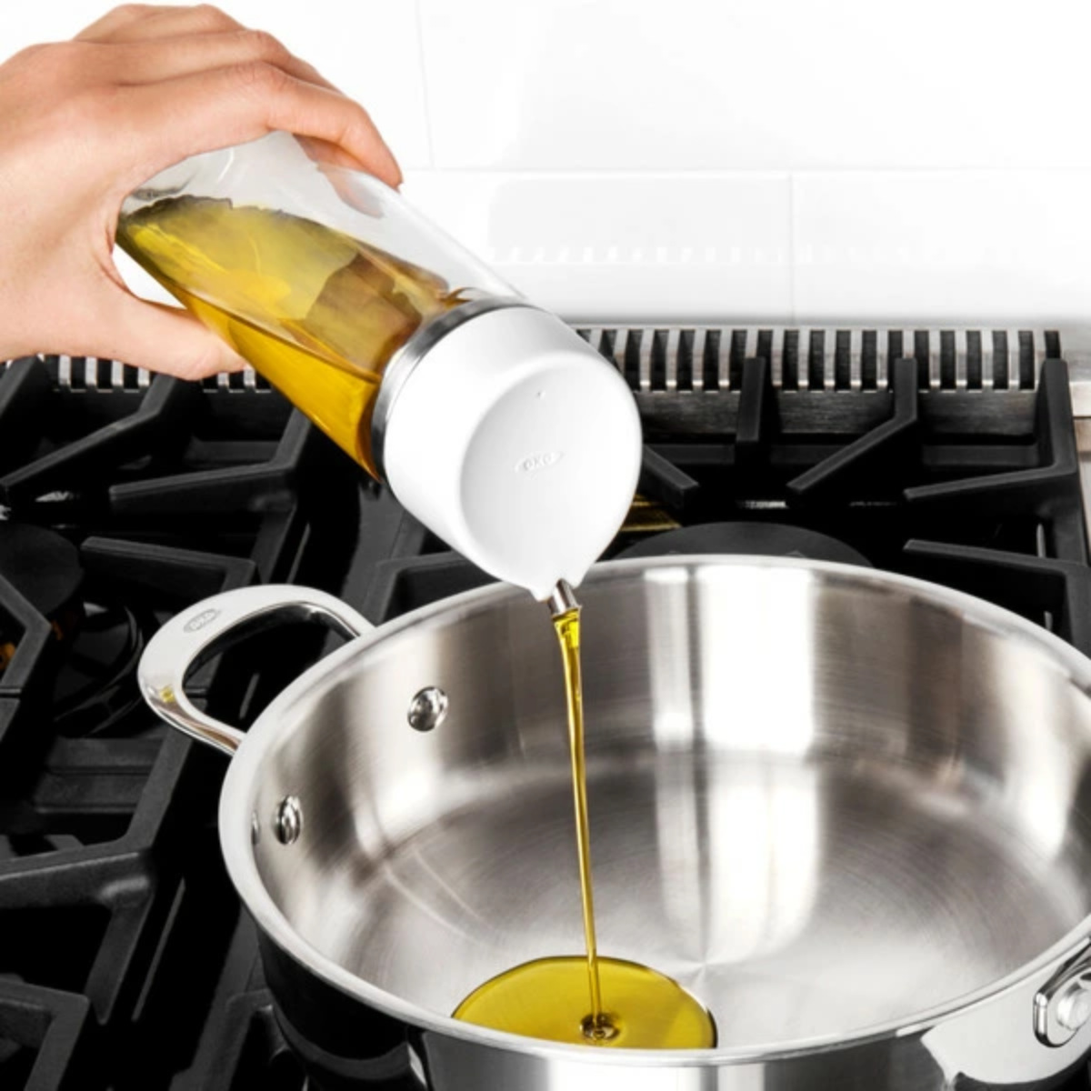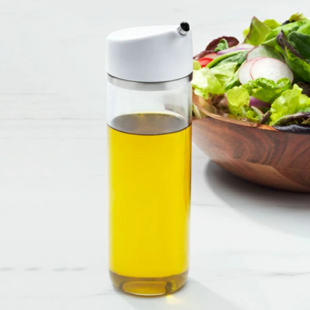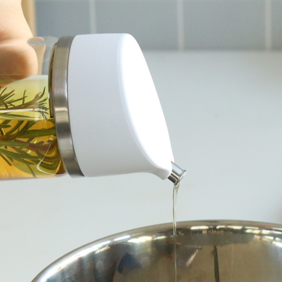 傾ける角度によって注ぎ量を調節できる、ガラス製のオイルボトルです。お料理の風味付けに少量垂らしたい時、調理中サッとフライパンに広げたい時、などシーンにあわせて使い分けられます。