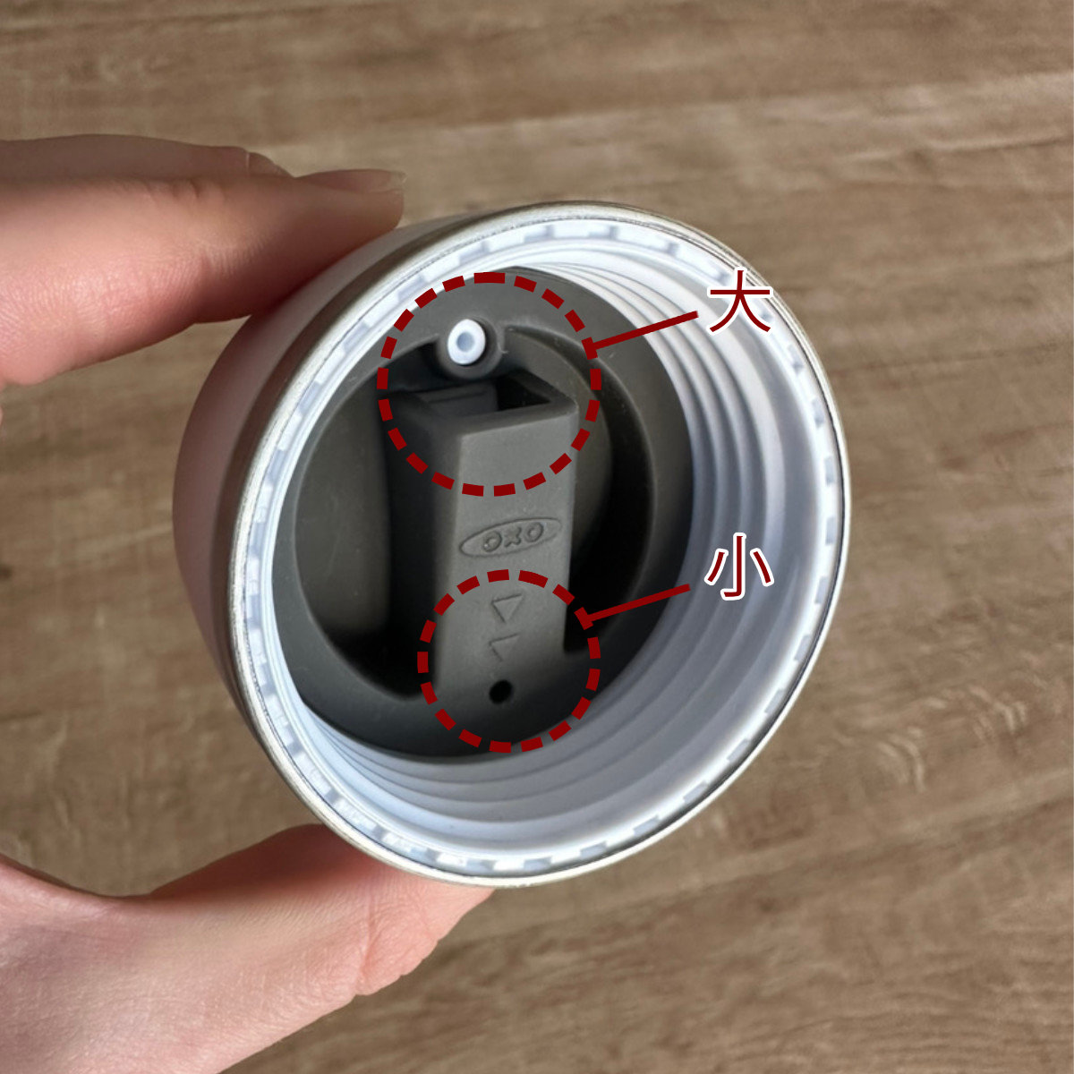 中のパッキンに大小ふたつの出口があり、小さく傾けると小出口から、大きく傾けると大出口から出るという仕組み。簡単な構造なので使いやすいです。