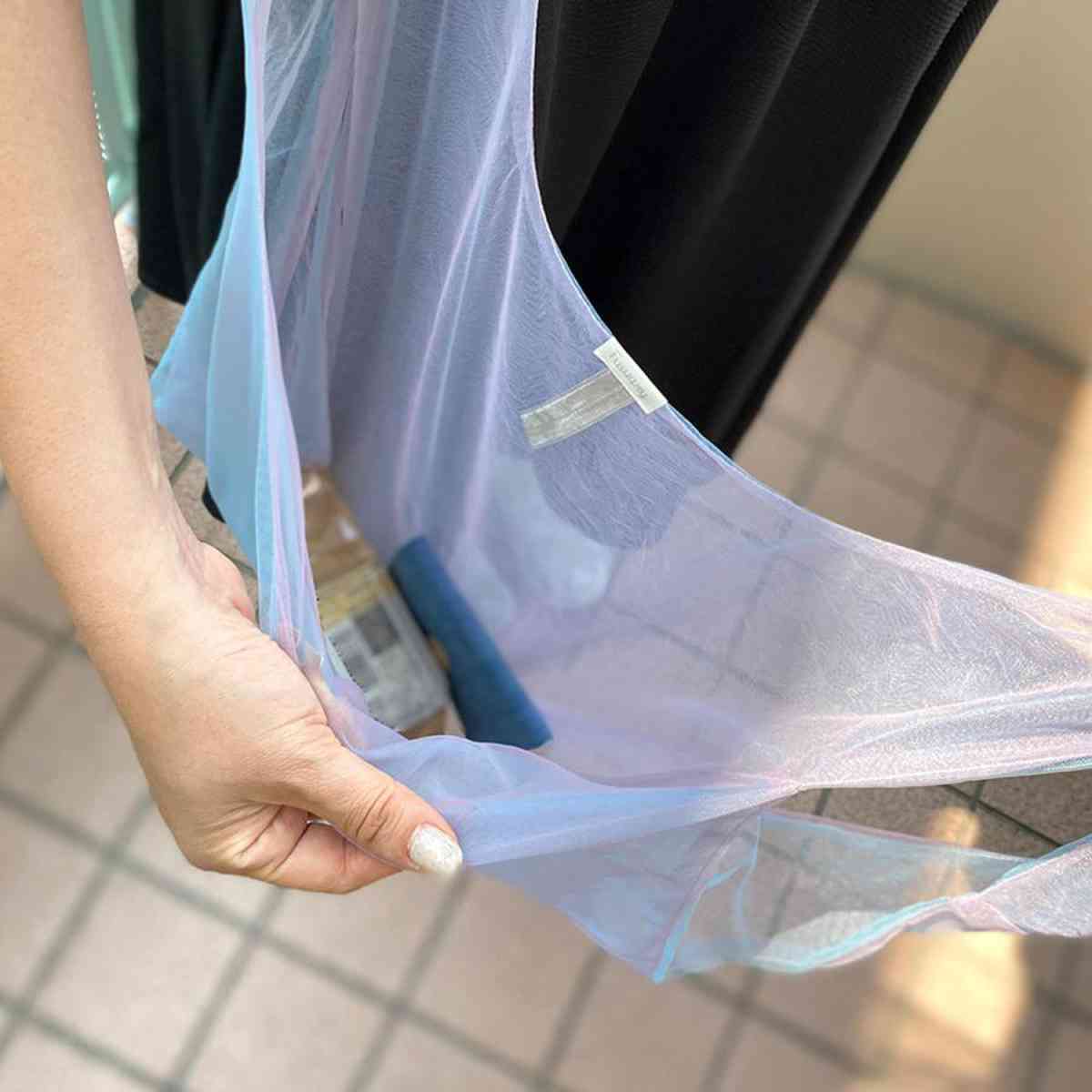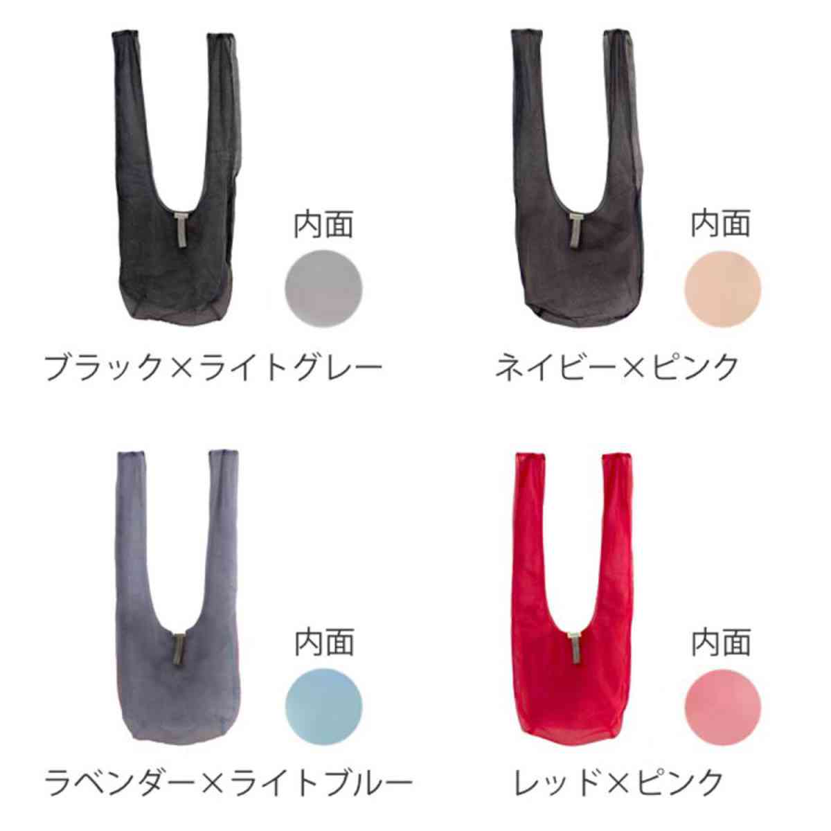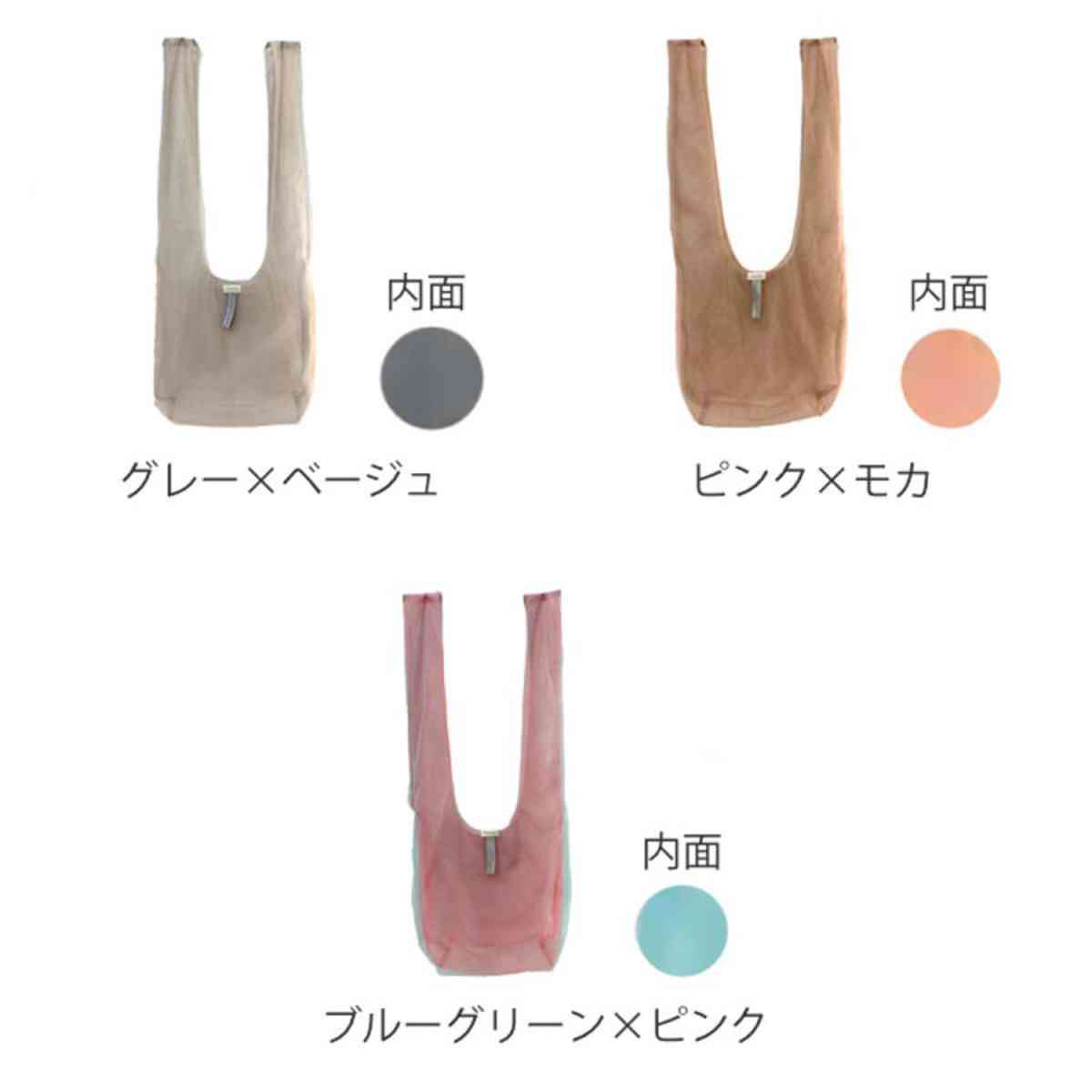リバーシブル仕様で気分に合わせて使えるエコバッグです。表裏で色が異なり、シースルー生地が重なることでグラデーションのように見えるおしゃれなデザインが魅力です。