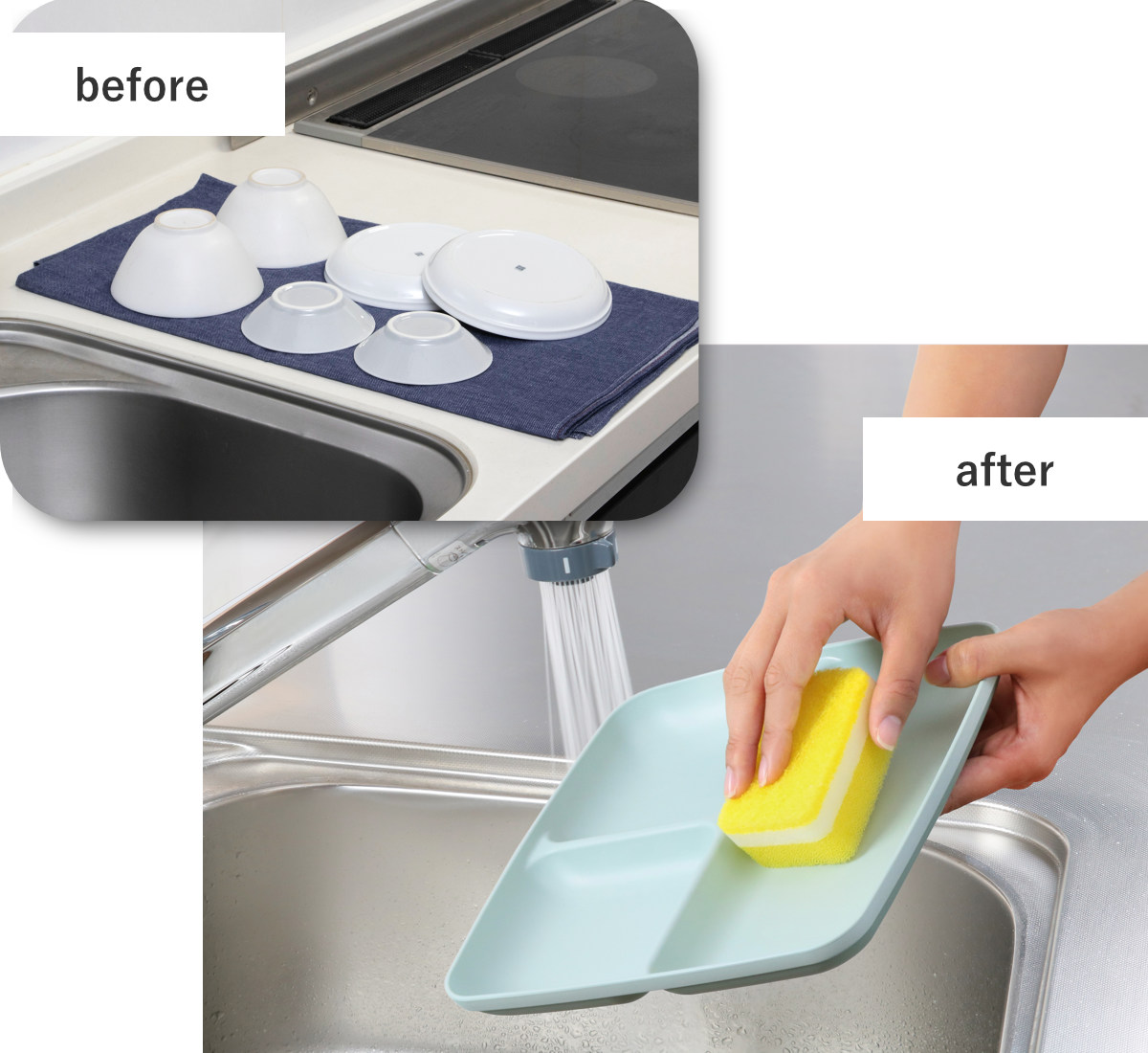 主食からおかずまでひとつのプレートに盛り付けできるので、洗い物はこれ一つ。毎日の家事をちょっと楽にしてくれます。表面はさらさらとしたマットな手触りで、汚れが落ちやすく水きりもスピーディーです。