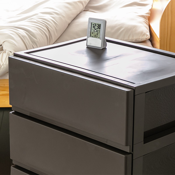 引き出しのフロントパネルや天板、支柱はサラサラとした手触りで光沢を抑えたマット加工が施されており、上品な空間を演出します。また、中身が見えないタイプなので、リビングや客間など人目に触れる空間にも安心して置くことができます。