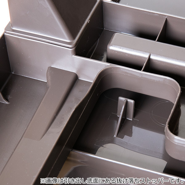 引き出し抜け落ち防止のストッパーが底面に付いています。引き出しと本体は完全に固定されているので、抜け落ちる心配がなく安心してお使いいただけます。