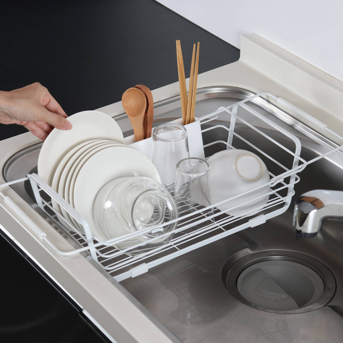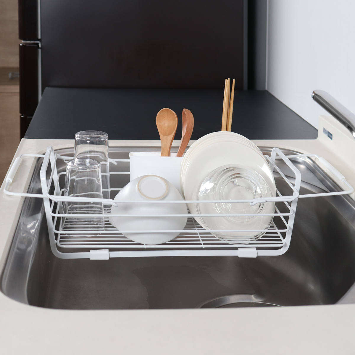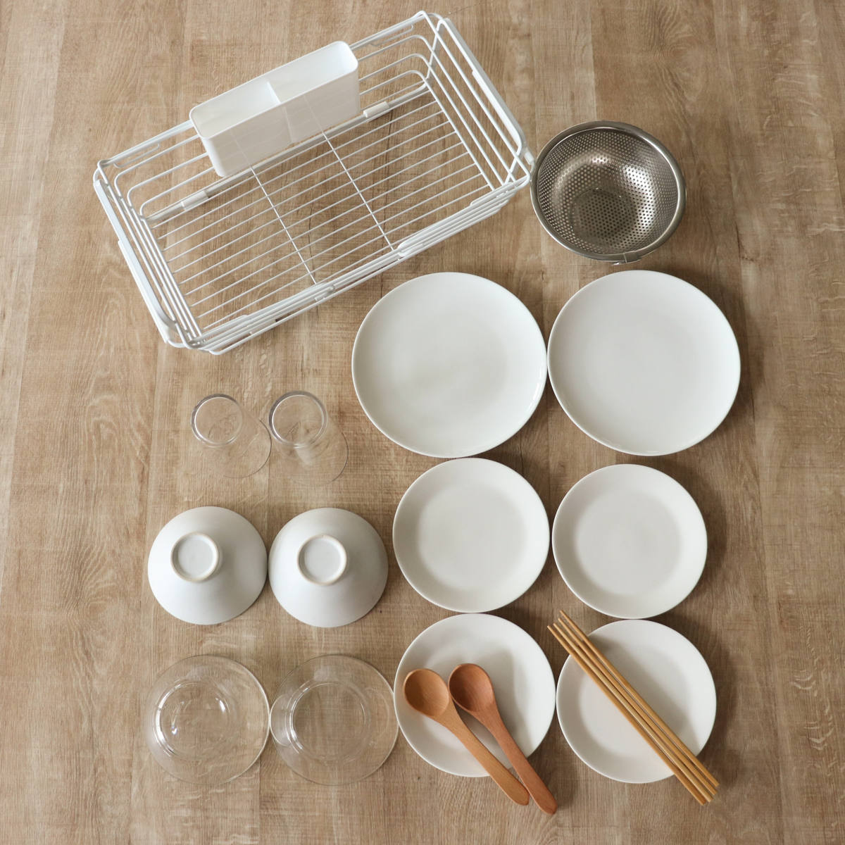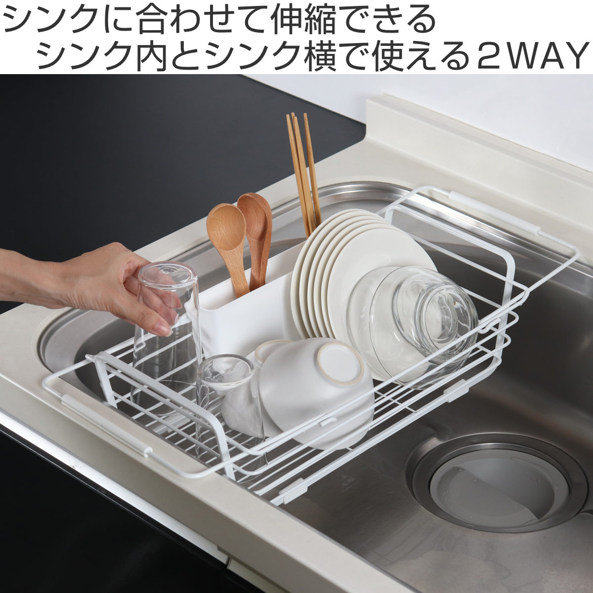 2人分の食器がまとめて入るサイズです。少人数のご家庭では、食器に加えて鍋やフライパン、調理器具もまとめて収納できます。食洗機のサブ水切りとしても使えます。