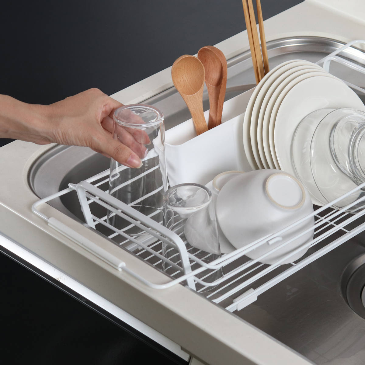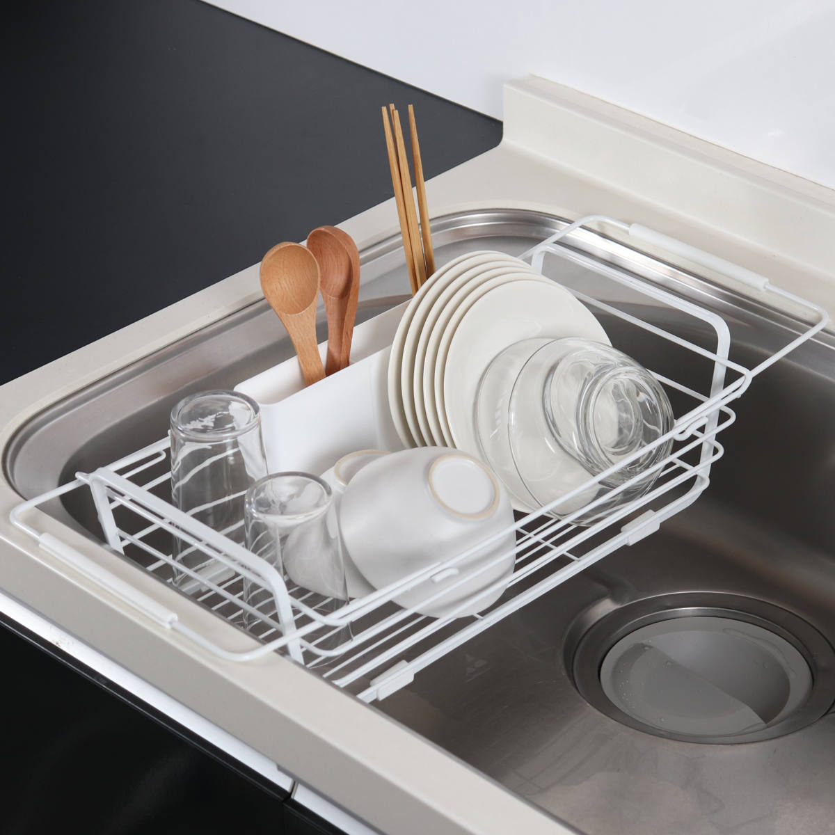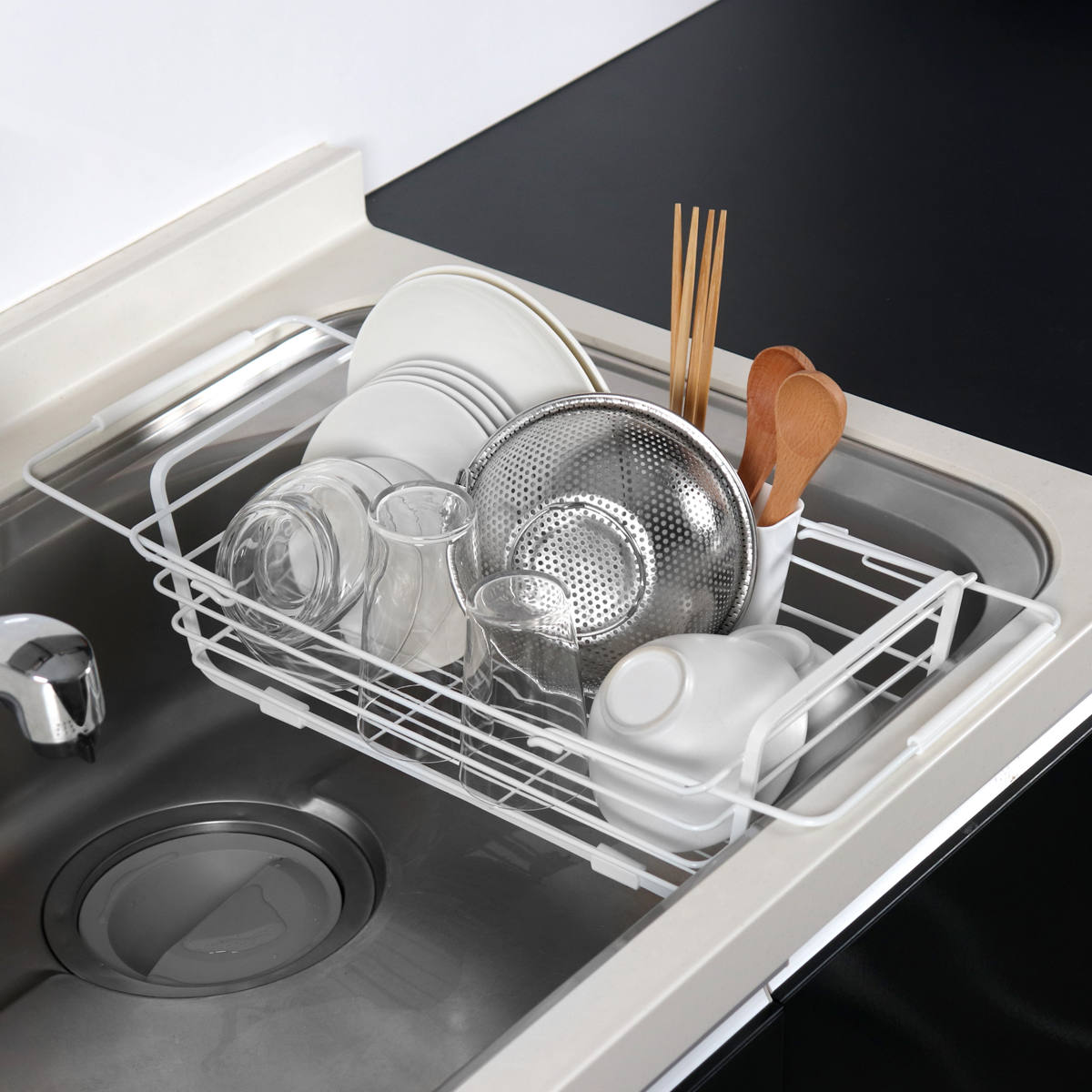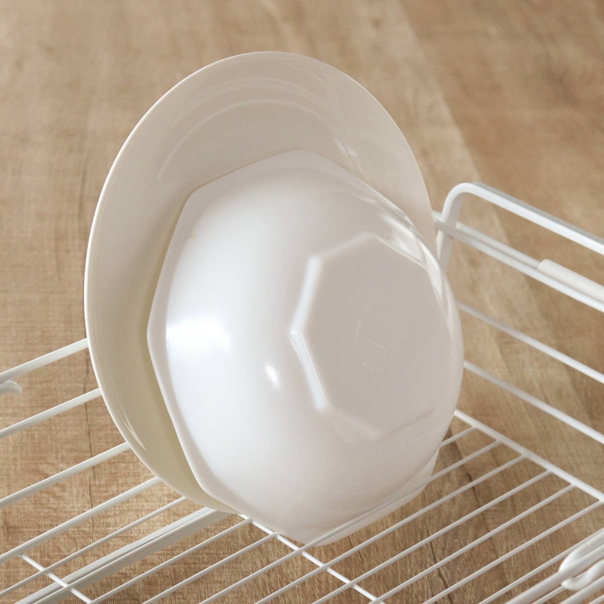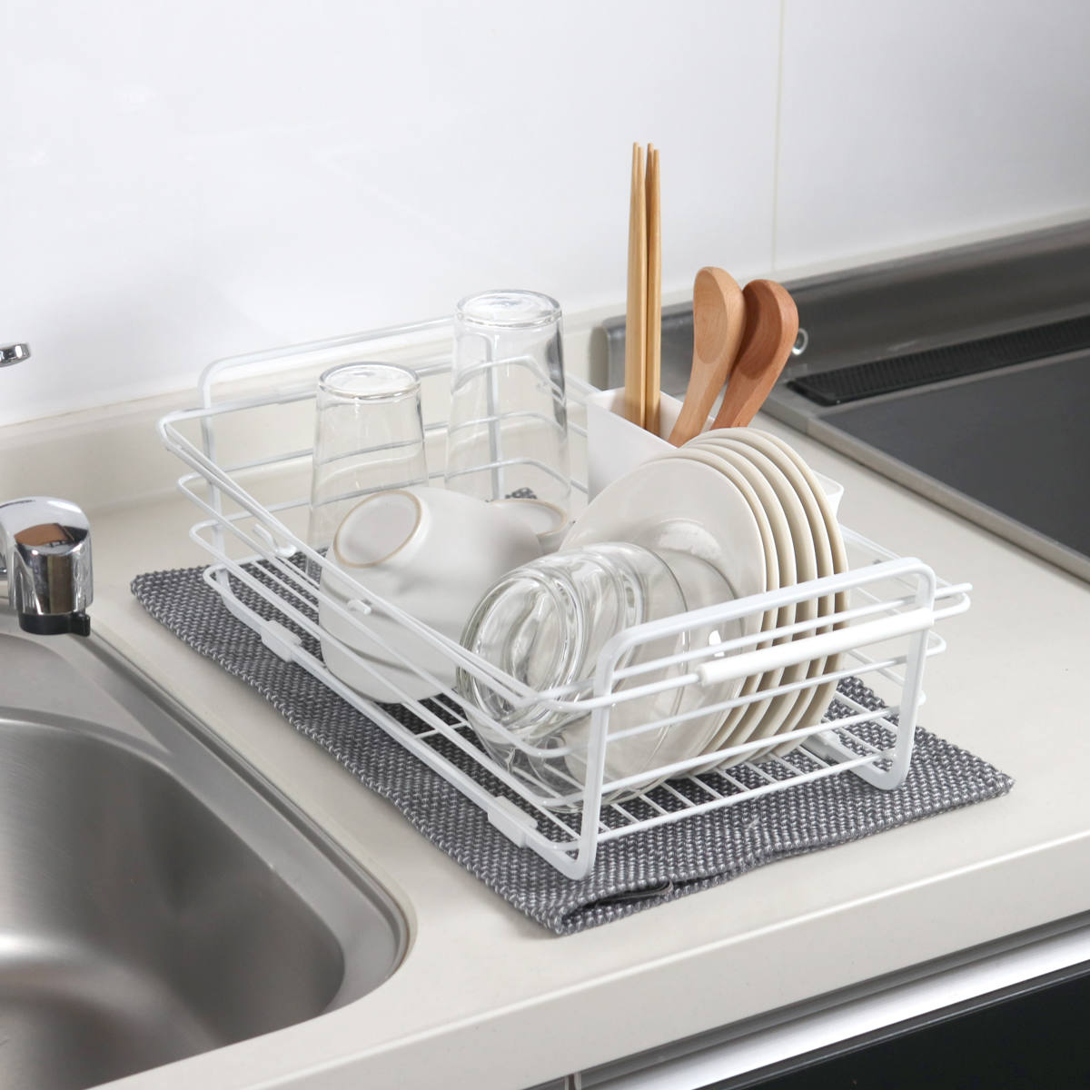 2人分の食器がまとめて入るサイズです。少人数のご家庭では、食器に加えて鍋やフライパン、調理器具もまとめて収納できます。食洗機のサブ水切りとしても使えます。