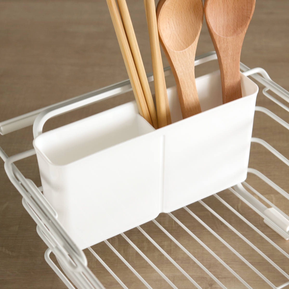 菜箸やお玉などのキッチンツールと長さや大きさの違うお箸やスプーン、フォークなども倒れることなく分けて乾かせる仕切り付きの水切りポケットが付属しています。水切りバスケットの好きな位置に掛けて使えます。