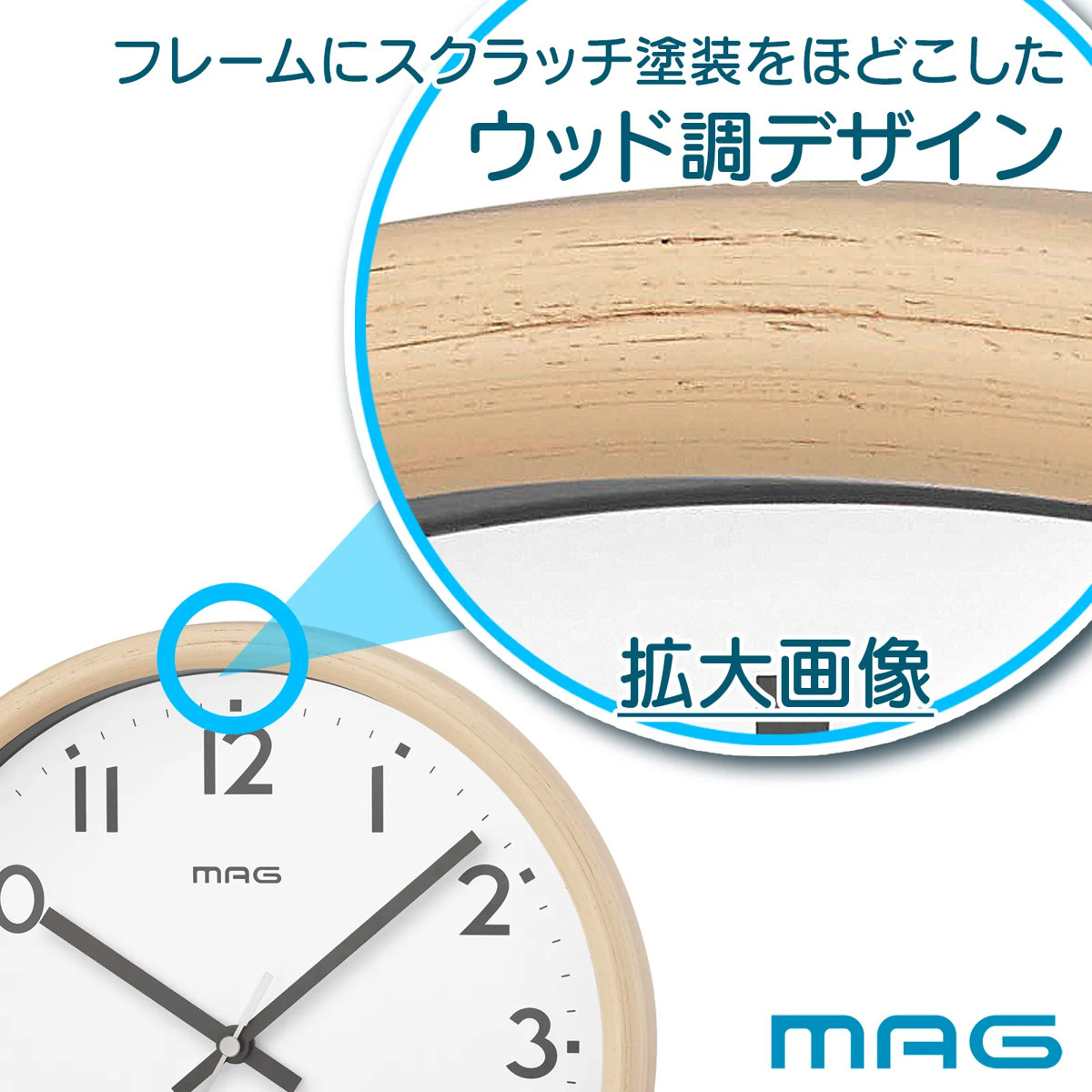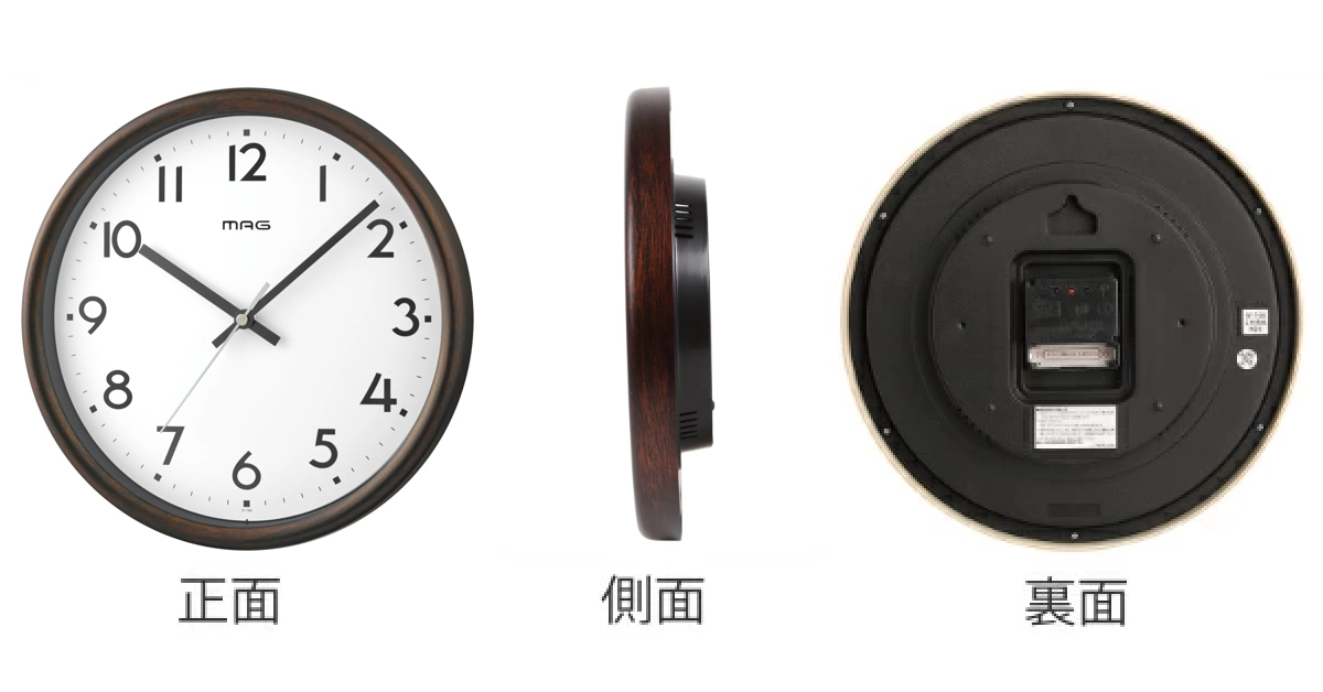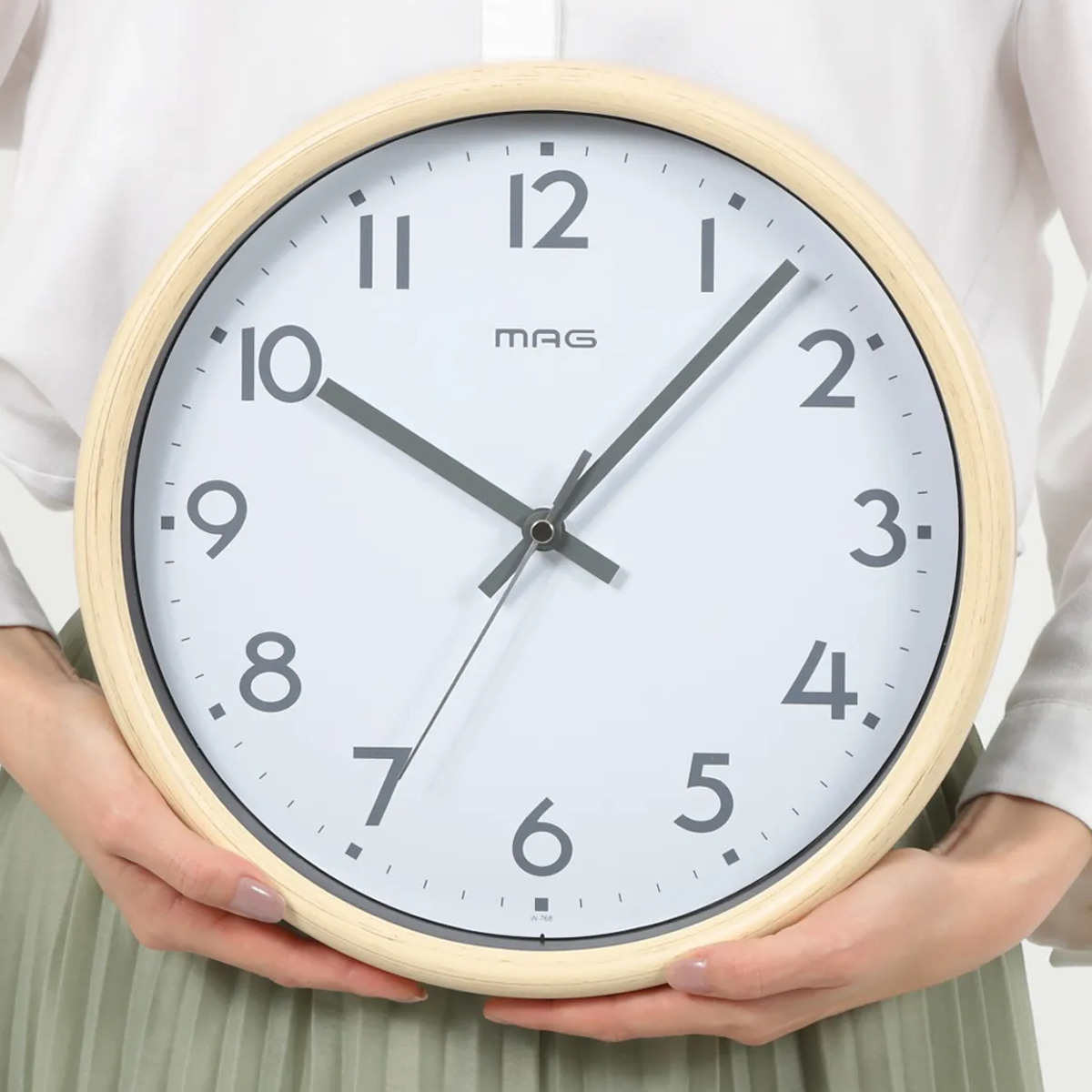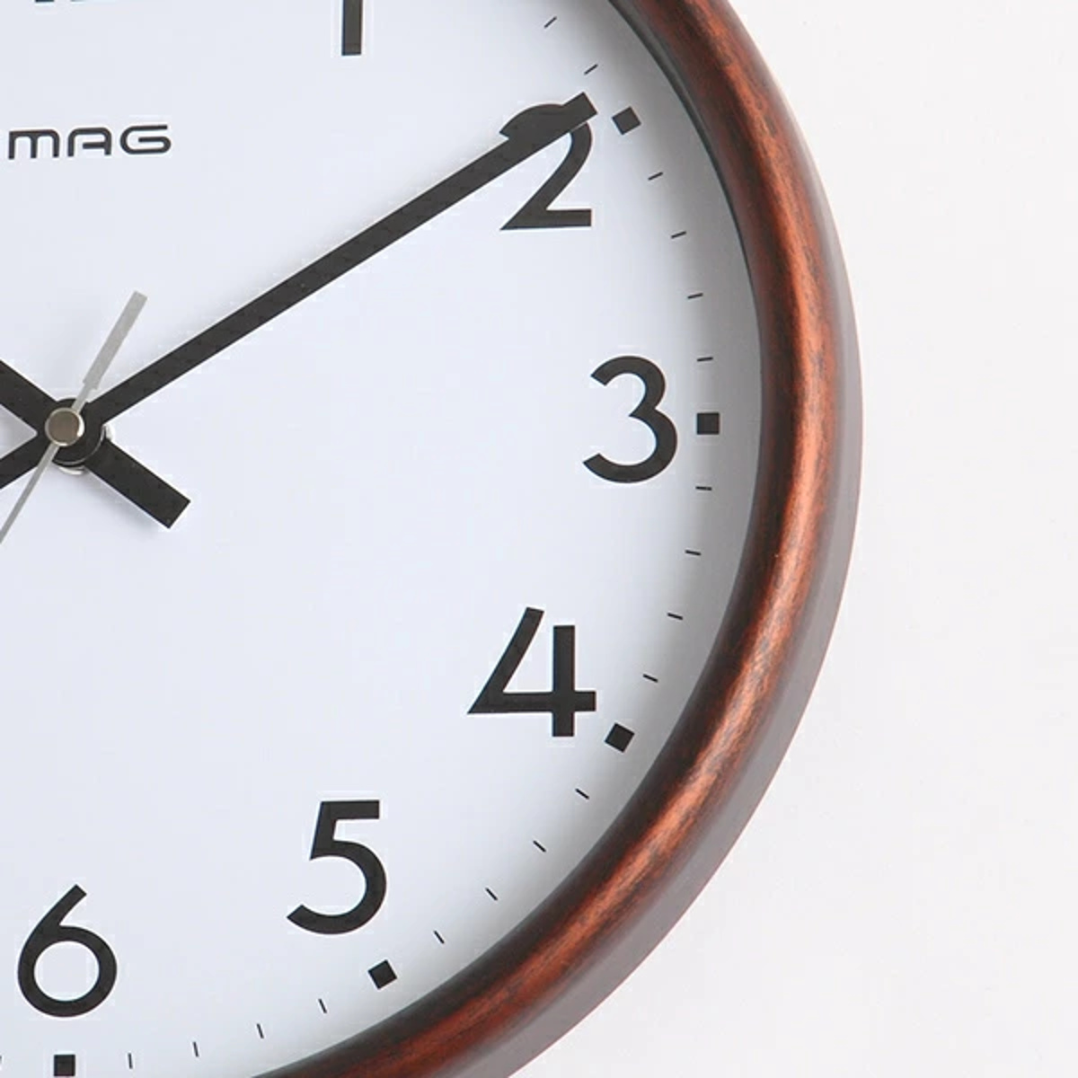 フレームにスクラッチ塗装をほどこした、ウッド調の電波時計です。見やすさは保ちつつも、インテリアとの調和を優先させるため、柔らかいフォントと主張しすぎないサイズの数字を配置しました。