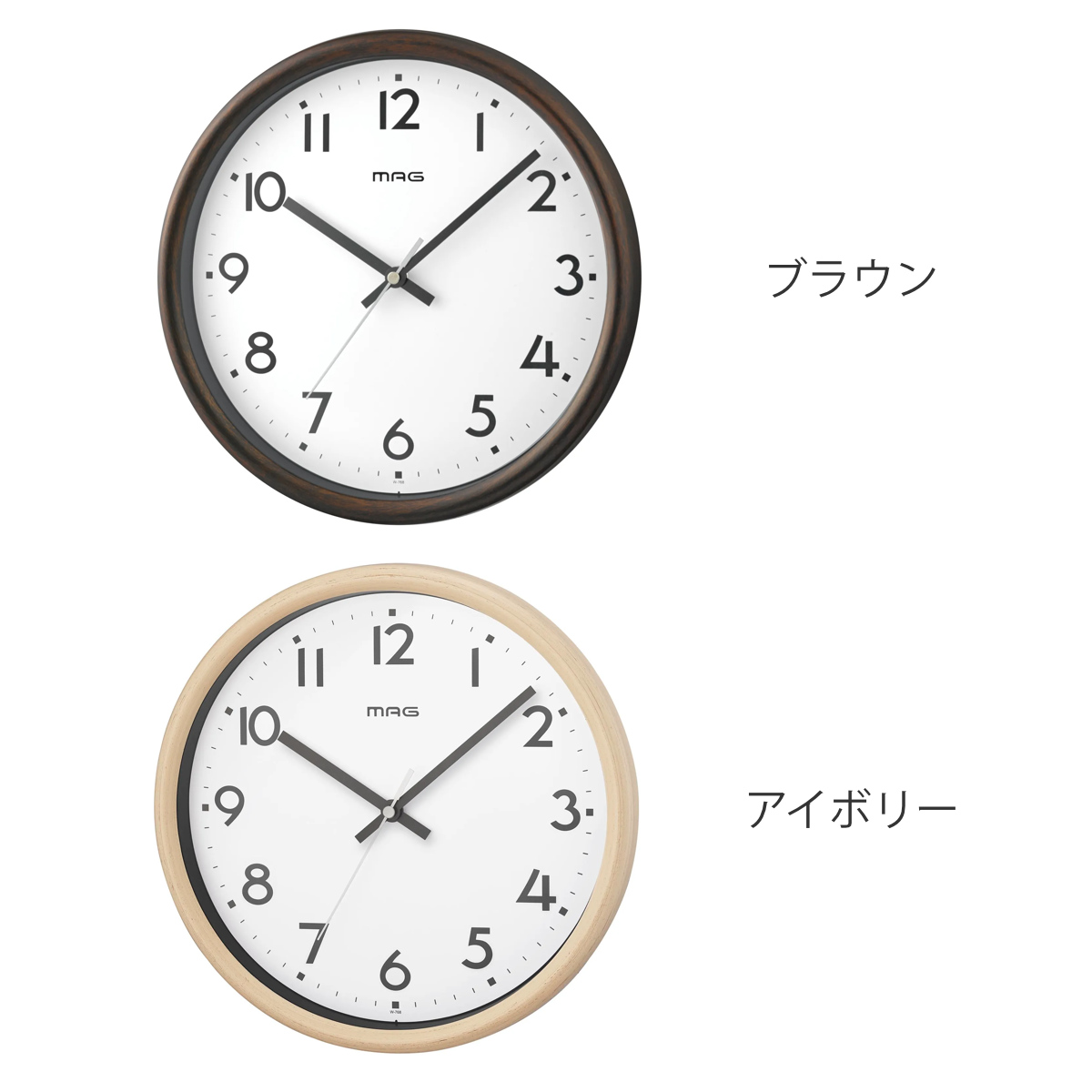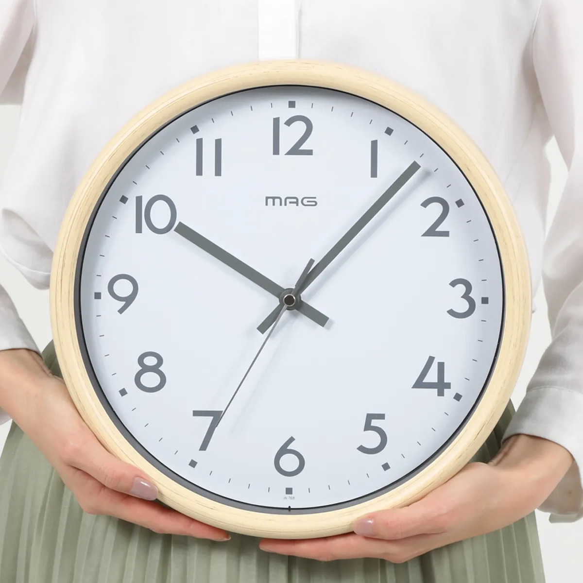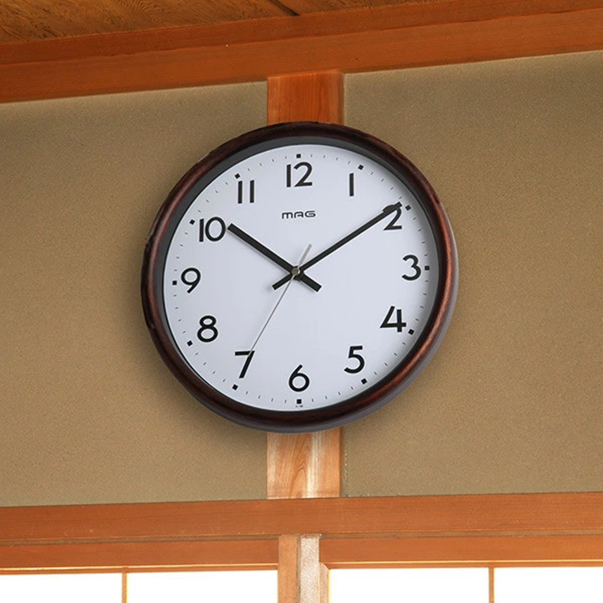 フレームにスクラッチ塗装をほどこした、ウッド調の電波時計です。見やすさは保ちつつも、インテリアとの調和を優先させるため、柔らかいフォントと主張しすぎないサイズの数字を配置しました。