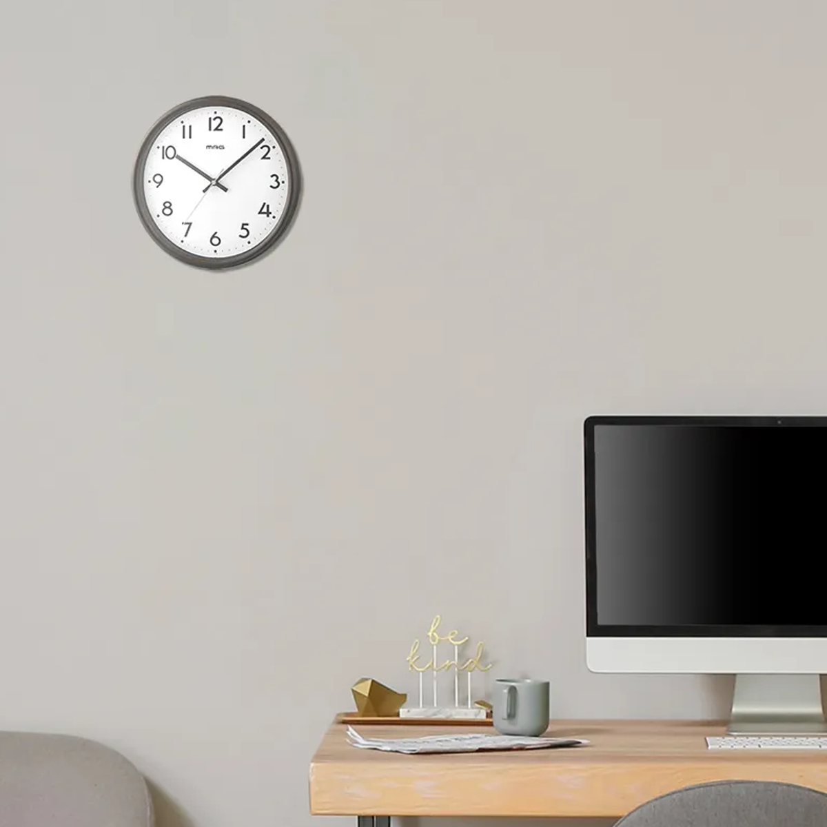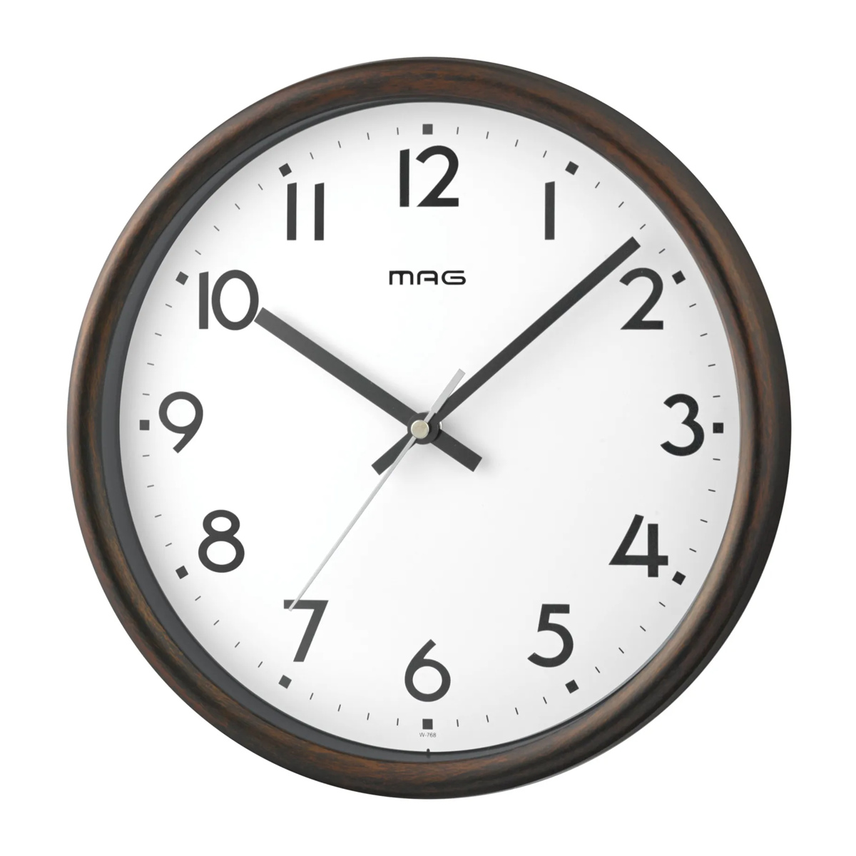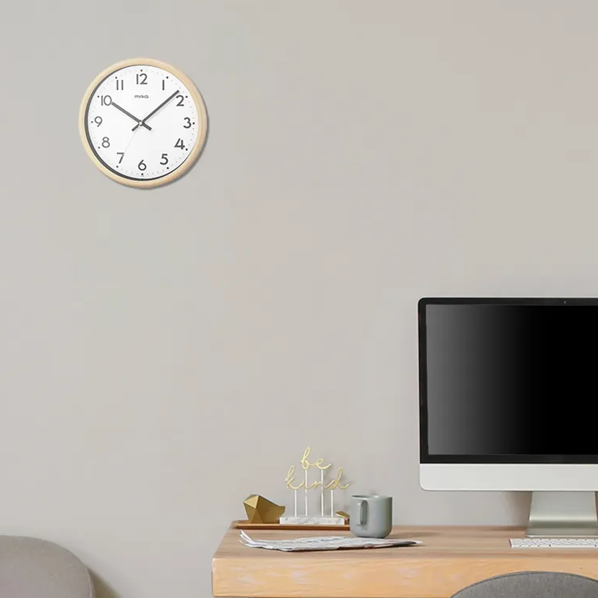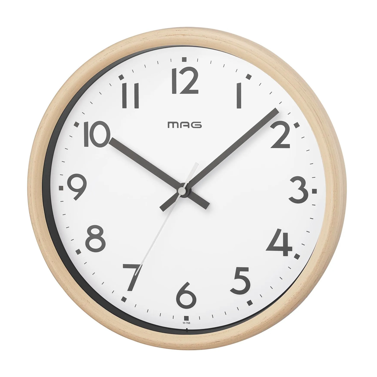 フレームにスクラッチ塗装をほどこした、ウッド調の電波時計です。見やすさは保ちつつも、インテリアとの調和を優先させるため、柔らかいフォントと主張しすぎないサイズの数字を配置しました。