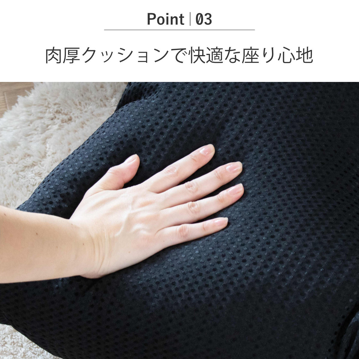 中材には程よい弾力のウレタンフォームを使用しています。分厚いクッションが身体をしっかりと支え、やさしく包み込みます。